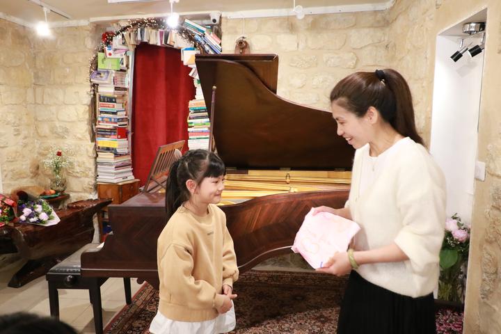今天,法国25个中法学琴的孩子纷纷给自己的妈妈准备了祝福、礼物、自制的母亲节卡片:然后弹奏自己喜欢的钢琴曲爱之歌献给他们的妈妈。无论孩子们送的礼物是精致美丽的,还是幽默风趣的,目的都只有一个,就是借母亲节,告诉自己的妈妈:我们爱你! Emma 弹奏了一首流行钢琴曲“卡龙(Canon)”、Benjamin 弹奏欢快的“Reborn ”,Léonard 、Mila 弹奏的海顿小奏鸣曲,Tiffany 的“Gavotte ”、Lina 的“Rive flows in your 、valse en la mineur de CHOPIN …… Laura 和Emma 的四手连弹“世上只有妈妈好”、Rébécca 和Déborah表演的四手连弹“Ah vous dirai -je Maman ”;特别是李飞燕和她的两个孩子六手联弹,演奏“法国民谣:Frères et Jaques ”……