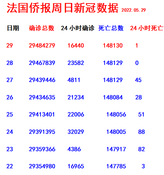 《法国侨报》讯:(记者 玉英)法国24小时内有16440人新增阳性!法国阳性总数有29484279人。 今天法国一人新冠死亡!法国总共有148130人死亡。
