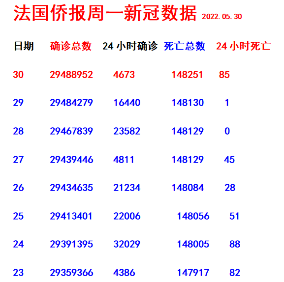 《法国侨报》讯:(记者 玉英)法国24小时内有4673人新增阳性,法国阳性总数是29488952人; 24小时内有85人死亡,全法国总共有148,251人死亡。