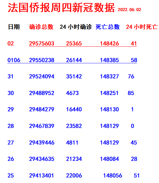 《法国侨报》讯:(记者 玉英)法国24小时内有人新增阳性25365人!全法国阳性总数达到人; 法国24小时内有41人死亡,全法国总共有148426人死亡。