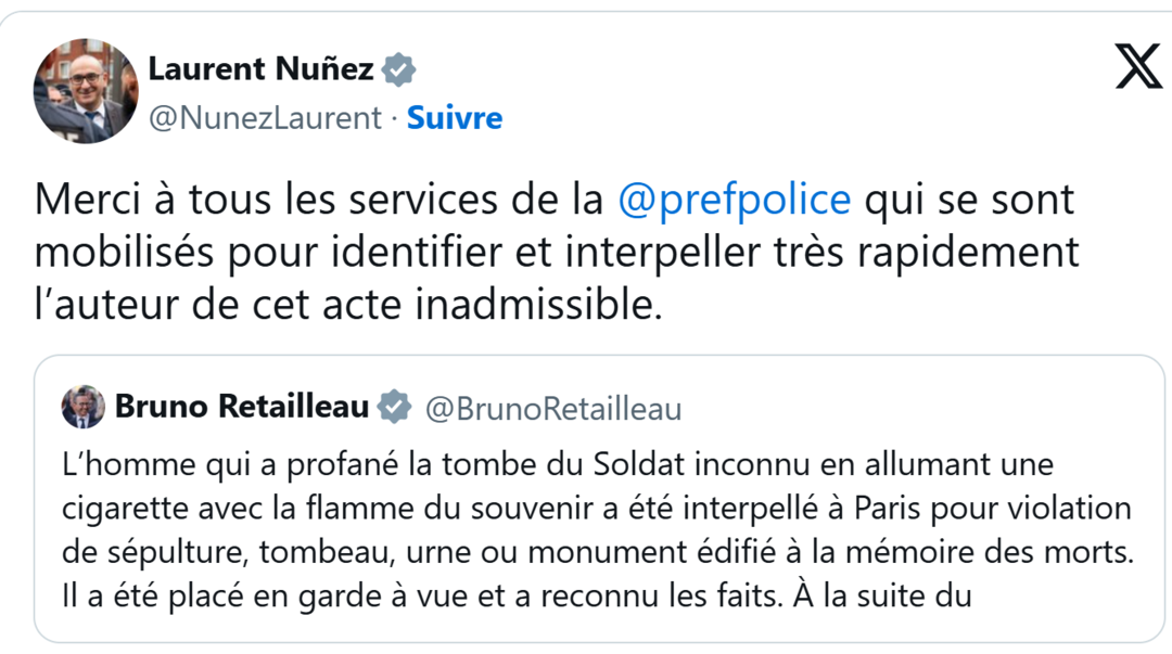 亵渎国家象征,警方迅速出手 法国警方当晚即对该男子展开追查,并在当日将其拘捕(interpellé),现已被带入警方羁押状态(garde à vue)。内政部长布鲁诺·雷泰约(Bruno Retailleau)证实,该男子已承认所作所为。 逮捕行动得到了巴黎警察局长洛朗·努涅兹(Laurent Nuñez)的直接报告支持,并依据《刑事诉讼法》第40条进行了司法通报。 可能面临监禁与高额罚款 根据法国《刑法典》相关条文,该男子涉嫌“亵渎坟墓、骨灰坛或纪念死者的纪念碑”,这一罪名最高可判处1年监禁和15,000欧元罚款。 布鲁诺·雷泰约在声明中表示,该男子的行为是对“为法国而牺牲者记忆的侮辱”。他将被移交司法机关审理。警方与司法系统对此案极为重视,称其为“不可接受的行为”。看热闹,可能违法 事件发生时,不少路人围观。法国媒体指出,这种“看热闹”的群众(法语:badauds)虽未直接参与事件,但在某些极端场合下若不报警、传播视频,亦可能涉道义或法律争议。 无名战士墓:法国国家象征之一 位于巴黎凯旋门下方的无名战士墓,是为了纪念在第一次世界大战中牺牲、身份不明的法国士兵而设。每日燃烧不息的“纪念火焰”,象征国家记忆与英烈尊严,具有极高象征意义。 该墓自1923年设立以来,已成为法国最神圣的纪念地之一,对其的不敬行为通常被视为对国家尊严的直接挑战。(来源:巴黎人报) 推广