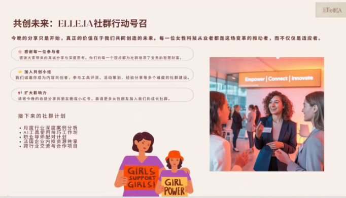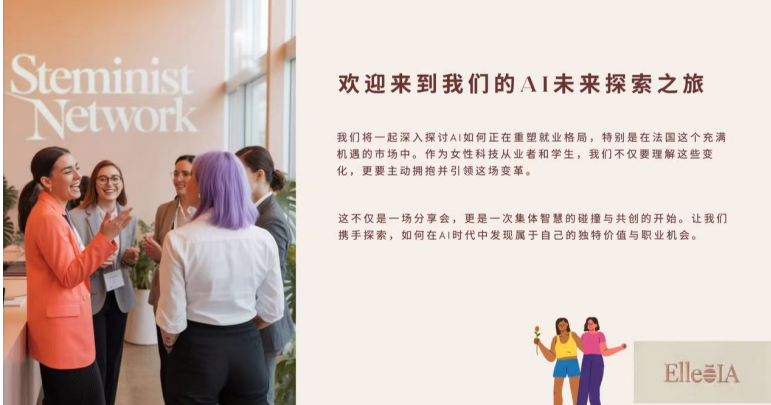 《法国侨报》讯:2025 年 9 月 21 日上午,Elle·IA 女性AI共学社在 Zoom 平台成功举办首场交流会。来自奢侈品、教育、科技与文化等领域的十余位女性成员齐聚一堂,围绕 AI 对就业的冲击与机遇、女性的职业转型与成长展开了两个多小时的深度对话。 初心与愿景 社群由 Stephanie 周(LUVINNOV 创始人、奢侈品与 AI 讲师)发起,她表示:“我们不是等待被替代的人,而是能够主动探索、学习、共创的人。” Elle·IA 致力于打造一个温暖、安全、专业的学习空间,帮助女性在 AI 浪潮中找到自信与位置。 交流亮点 就业趋势:AI 正在加速淘汰流程化岗位,重塑教育、医疗等行业,并催生 AI 产品经理、算法伦理顾问等新职业。 创意构想:一位成员提出“美食中文”课程的设想,结合语言与饮食文化,探索跨文化创业新模式。 职业转型:分享了法国本地资源(Transitions Pro、APEC),鼓励女性结合兴趣与天赋规划新路径。 实用工具:介绍 ChatGPT、Perplexity、Make、CapCut 等 AI 工具,未来还将通过工作坊降低学习门槛。 社群特色与计划 Elle·IA 坚持公益属性,不设付费门槛。巴黎多家咖啡馆和书店已提供支持,合作企业也愿意提供工具测试资格。下一步,社群将举办线下工作坊,围绕“职业规划 × AI工具实操”,并推动中法女性社群联动,拓展资源共享。 这场交流会不仅是一次信息分享,更是女性与 AI 未来的对话。从就业挑战到创业梦想,每位成员都在探索属于自己的答案。Elle·IA 的使命,就是让女性在 AI 时代中携手前行,点燃未来无限可能。 推广 |