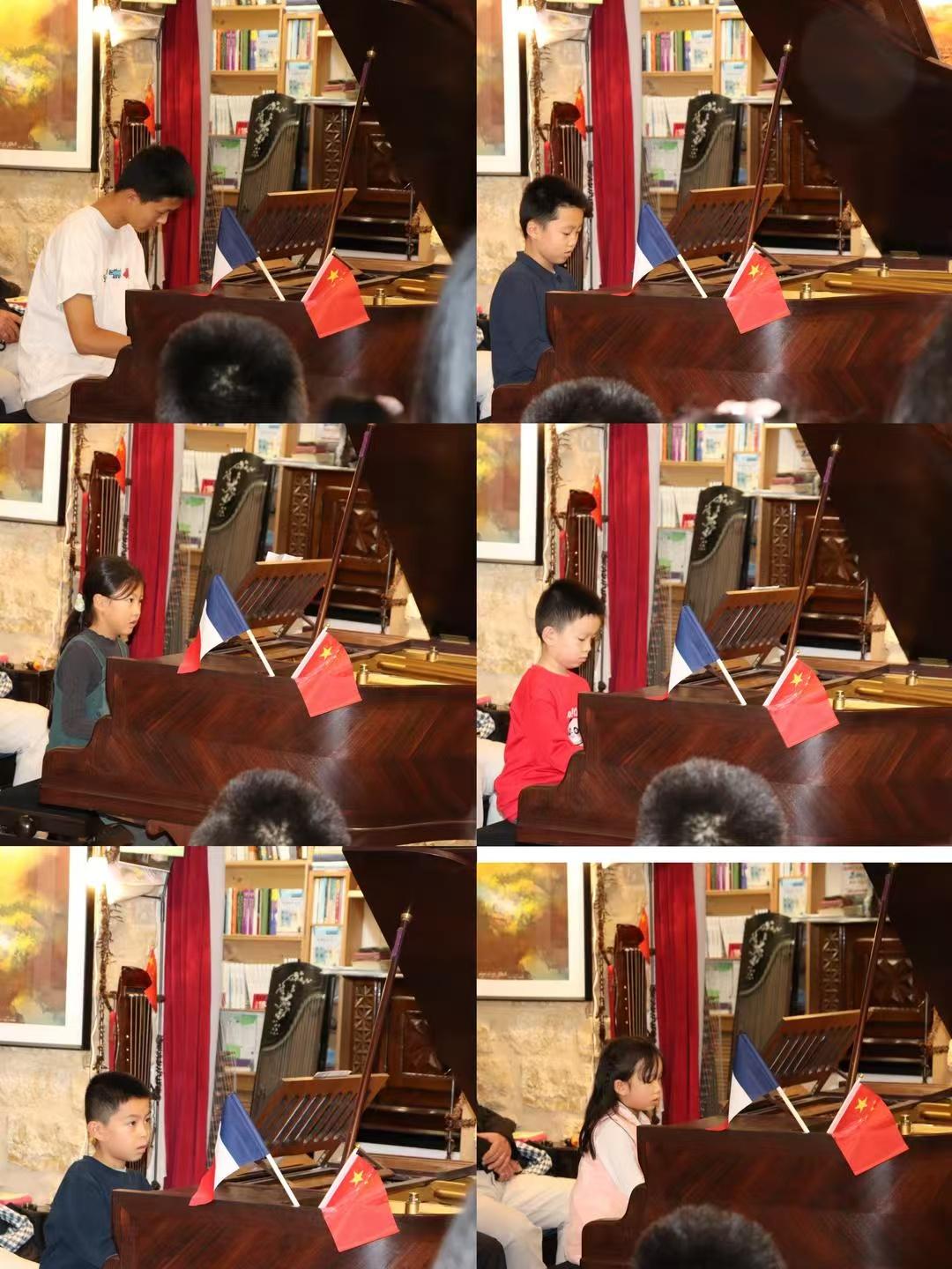 活动中,法国侨报社长钱海芬特别准备了中法双语的小环节。她亲手在纸上写下“国庆快乐”“中秋快乐”和“月饼”等汉字,并为孩子们标注拼音。现场布置了中法两国国旗,在红蓝相映、氛围热烈的环境中,中法孩子们一边品尝香甜的月饼,一边伴着钢琴的旋律,轻松学会几个与节日相关的中文词汇,也体会到语言与文化的奇妙联结。 钱海芬笑着对孩子们说:“记忆到不了的地方,文字可以到达;灵魂到不了的地方,音乐可以到达。”她希望大家通过这种沉浸式的体验,把中国节日的温情与文化的韵味铭记在心。这一刻,文字成了桥梁,音乐成了纽带,让两种文化在孩子们的心中自然交织…… 接着,法国孔子学院老师淑婷带来生动的月饼分享。 她结合视频影像,用中法双语娓娓道来,让孩子们在图像和声音的交织中,轻松走进中国传统神话的世界。 在她的讲述中,嫦娥奔月的唯美传说徐徐展开。嫦娥为了守护人间,不得已吞下仙丹,孤身飞向月宫,与桂树、玉兔为伴,留下对人世间的深切牵挂。孩子们看着屏幕上皎洁的月亮,仿佛真的看见了广寒宫里的身影,也体会到“月圆人团圆”的深意。 紧接着,后羿射日的英勇事迹在视频和解说中鲜活再现。十日齐出的炙热场景让孩子们连声惊叹,而当后羿拉弓搭箭,接连射下九个太阳时,现场响起了热烈掌声。 故事不仅展现了中华文化中的英雄精神,也让孩子们感受到拯救苍生、守护家园的力量。 淑婷老师以中法文的双语讲解,使小朋友和家长都能听懂并共情。她一边讲述,一边与孩子互动提问,现场笑声与惊叹声此起彼伏,气氛温馨而热烈。 熊老师旅法多年,桃李满巴黎。他用音符播撒希望,也用耐心守护梦想。 这个中秋,他的学生们带着真挚的琴声登上舞台。孩子们或身着节日盛装,或略带羞涩,轻轻落座在钢琴前。灯光洒下,黑白键在指尖颤动:有稚气未脱的小朋友,刚刚学琴不久,音符稚嫩却真诚,像月夜里最初升起的一弯新月;有温柔的家长,在琴声里寄托思念与祝福,每一个和弦都带着温情;还有兄妹俩并肩而坐,四手联弹,动作默契,琴声交错宛如月光与清风,流淌出家的温暖与团圆的喜悦。