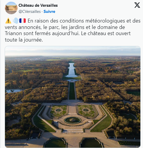 据法国气象局(Météo France)预报,上午或将短暂迎来平静,但下午风力将明显增强,阵风可达每小时80至90公里,并伴随强降雨。市政府呼吁市民尽量避免外出,尤其不要靠近林地与河岸地区。 同样采取防范措施的还有凡尔赛宫。宫方在其官方账号上表示,为保障游客安全,宫殿周围的公园、花园及特里亚农庄园将全天闭园。原计划仅中午起关闭,但因风势加剧,管理方决定提前取消开放。主馆部分仍照常接待游客。 在巴黎周边的上塞纳省,当局也下令关闭所有公共绿地与游园场所,避免树枝坠落等意外。 气象部门已将包括巴黎在内的多个省份列为橙色警报区,提醒民众关注最新天气通报。与此同时,法兰西岛地区部分铁路线路也出现延误或中断:RER D线因铁轨上有树枝阻塞,Juvisy至Corbeil-Essonnes区间暂停通行至上午11时。 气象专家警告,暴风“本雅明”仍将持续影响法国北部和沿海地区。官方提醒公众避免户外活动,确保人身安全。(来源:bfm) 推广
