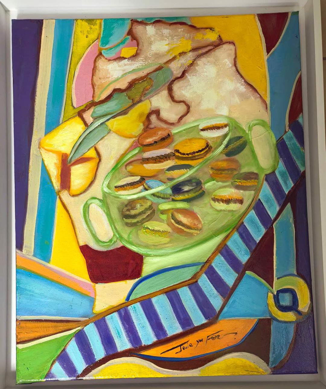 这幅画以一只盛满马卡龙的玻璃碗为主体,透明的器皿映照出多层次的色彩变化。蓝、黄、粉的冷暖交织,形成明快的节奏感。 李玉芬以日常之物表达精神意象,甜点在她笔下不再只是味觉的象征,更代表生活的甜美与爱的记忆。画面既有理性的结构,又流露出抒情的温度,正如她自己所说: “我画的不是甜点,而是生活的柔软部分——那一点光与爱。” 几幅作品从人物到抽象,再到静物,既是李玉芬艺术历程的缩影,也是她心灵的三重奏。她用色彩演绎情感,用笔触诠释和平与美的信念。 在巴黎的艺术殿堂中,李玉芬以东方女性的温度和世界艺术的视野,让“色·光·情”的交响,在纪念与希望的时空中久久回荡。 如果想要收藏她的作品,请来参加展览 展览信息 时间:2025年11月15日(星期六)至16日(星期日) 开幕式:11月15日(星期六)14:00 地点:法国潮州会馆(Centre Commercial Oslo, 44 Av. d’Ivry, 75013 Paris) 开放形式:免费向公众开放 相关文章链接如下 1,法国纪念抗战胜利和反法西斯战争胜利80周年书画交流展11月15日巴黎举行 2,光与山的交响 朱毅中油画作品将亮相巴黎参加纪念抗战胜利80周年书画展 3,丹青颂和平·翰墨映巴黎——韩三平将赴法参加纪念抗战胜利80周年书画展 4,光影之间·山水无声:中国著名画家潘文良将赴法参加纪念抗战胜利80周年书画展 5,笔墨抒华章·翰墨颂和平:徐国良将赴法参加纪念抗战胜利80周年书画展 推广