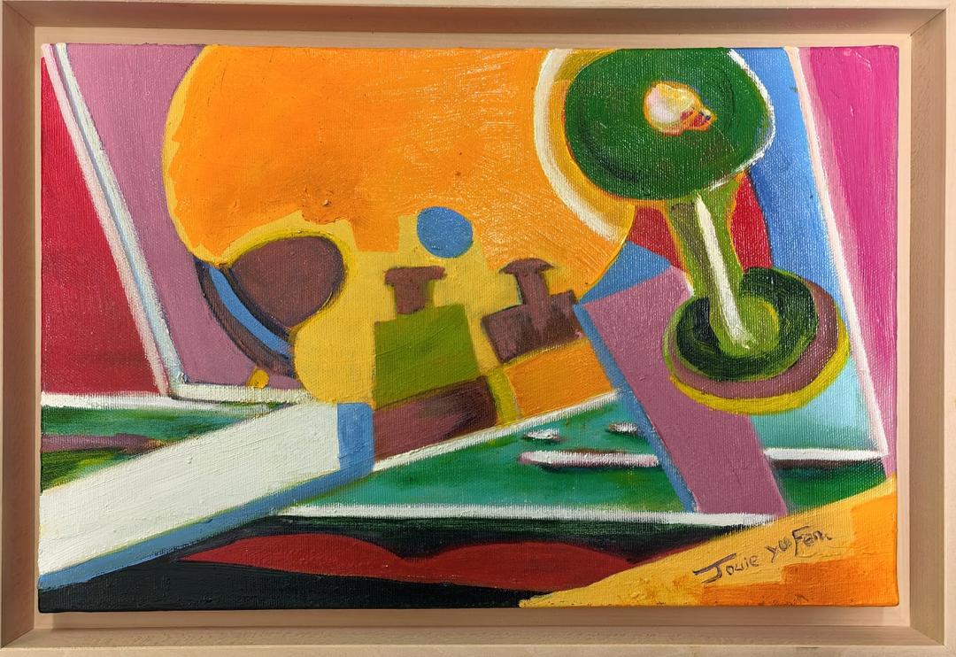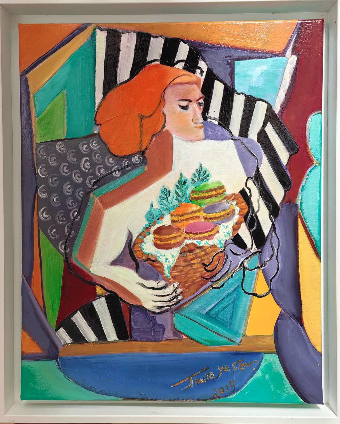 这是一幅充满现代感的抽象作品。画面由圆、方、斜线交错构成,色彩对比强烈却又和谐统一。李玉芬通过几何构成探索“光”与“形”的关系,使作品兼具理性与诗意。 橙色象征热度,绿色寓意生命,线条的律动仿佛时间的流逝。她以抽象之形,述说内在情感的流动,让观者在节奏与静默之间感受生命的呼吸。 《甜点的幻想》——生活的诗意与温度