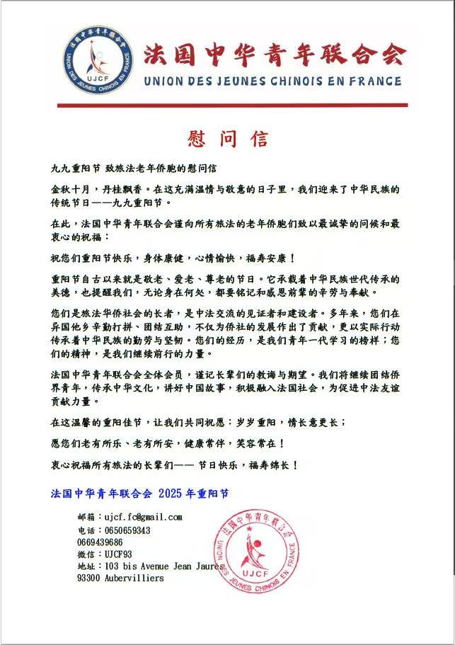 刘甜会长表示:“我们的义工和志愿者,是协会最宝贵的财富。重阳节不仅是敬老的节日,更是传递温情、感恩与团结的时刻。希望通过这样的活动,让每一位默默奉献的侨界长者,都能感受到家的温度与大家庭的关怀。” 从清晨出发到傍晚归途,中华青年联合会的慰问脚步走过了多个家庭,也走进了人心。一路上,温情与笑声相伴,每一次问候、每一个拥抱,都让这个重阳节格外温暖。 中华青年联合会始终秉承“侨界有情,青年有责”的宗旨,用行动诠释爱与责任。未来,协会将继续在关爱老侨、扶助同胞、促进中法友谊等方面不懈努力,让“公益”的种子在法兰西的土地上持续生根发芽,开出更温暖的花。 同时,协会也呼吁更多热心侨胞和青年朋友加入义工队伍,尤其欢迎会法语、能够协助翻译及沟通的志愿者参与其中。