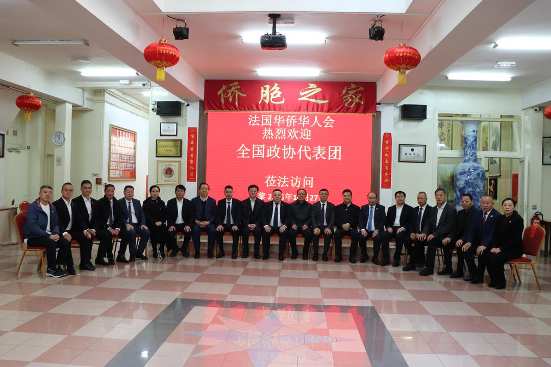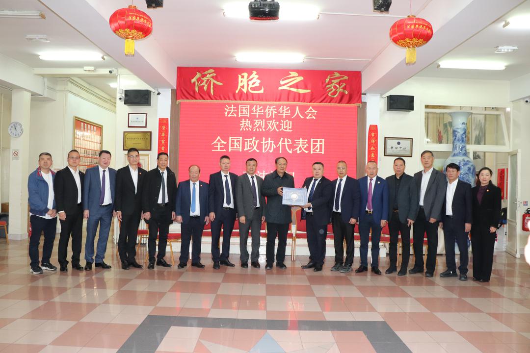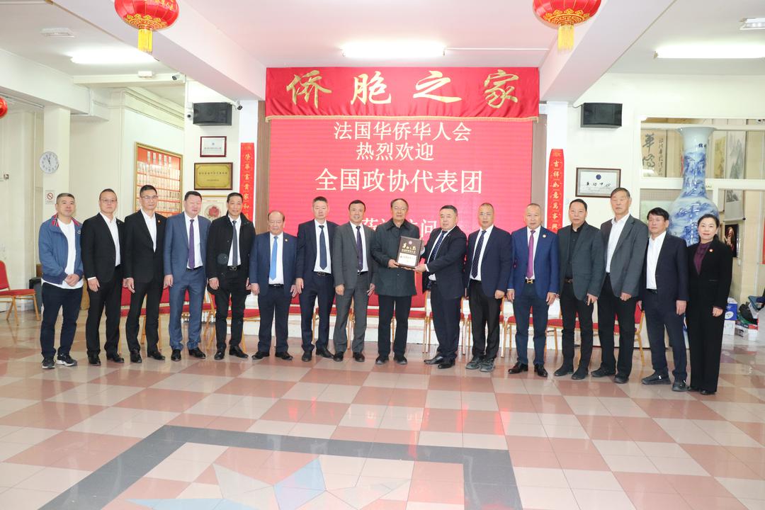 法国华侨华人会与全国政协代表团互赠纪念品并合影留念。