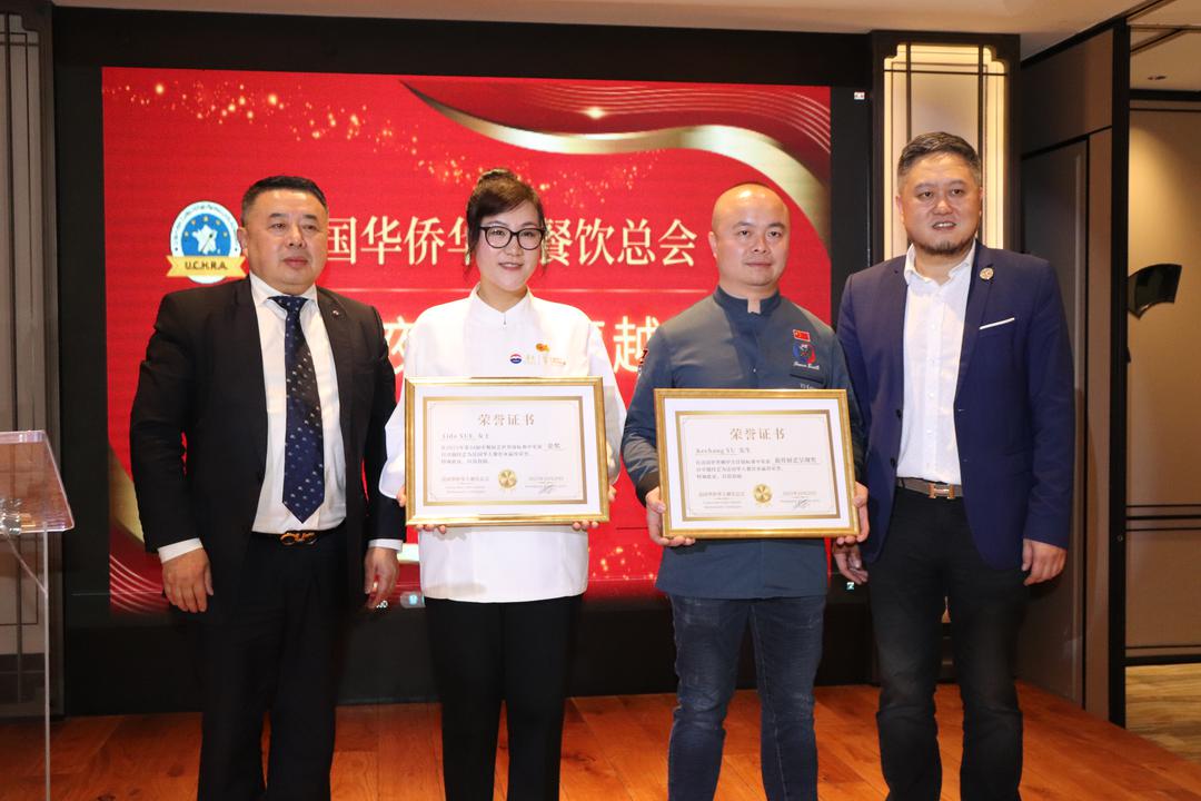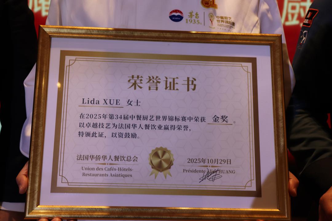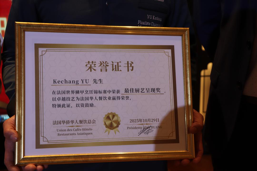 蔡君柱指出,法国华侨华人餐饮总会多年来团结旅法餐饮界同仁,在法国乃至欧洲持续推动中餐的发展与传播,从厨房到餐桌、从技艺到文化,中餐早已成为中法文化交流的重要桥梁。薛黎达的获奖,是对华人厨艺水平的国际认可,也让世界再次感受到中华饮食文化的独特魅力与深厚底蕴。 他强调,这一荣誉的背后,是一代又一代旅法华人餐饮人的辛勤耕耘与不懈追求,是他们坚持品质、精益求精的精神让中餐在异国他乡不断发光发热,成为连接中法两国人民情感的重要纽带。 值得一提的是,当晚蔡君柱主席为两位获奖者分别颁发了法国华侨华人餐饮总会特制的荣誉证书: ——Lida Xue在2025年第34届中餐厨艺世界锦标赛中荣获金奖,以卓越技艺为法国华人餐饮业赢得荣誉。特颁此证,以资鼓励。 ——Kechang Yu在法国世界鳞甲烹饪锦标赛中荣获最佳厨艺呈现奖,以精湛技艺为法国华人餐饮业赢得荣誉。特颁此证,以资鼓励。