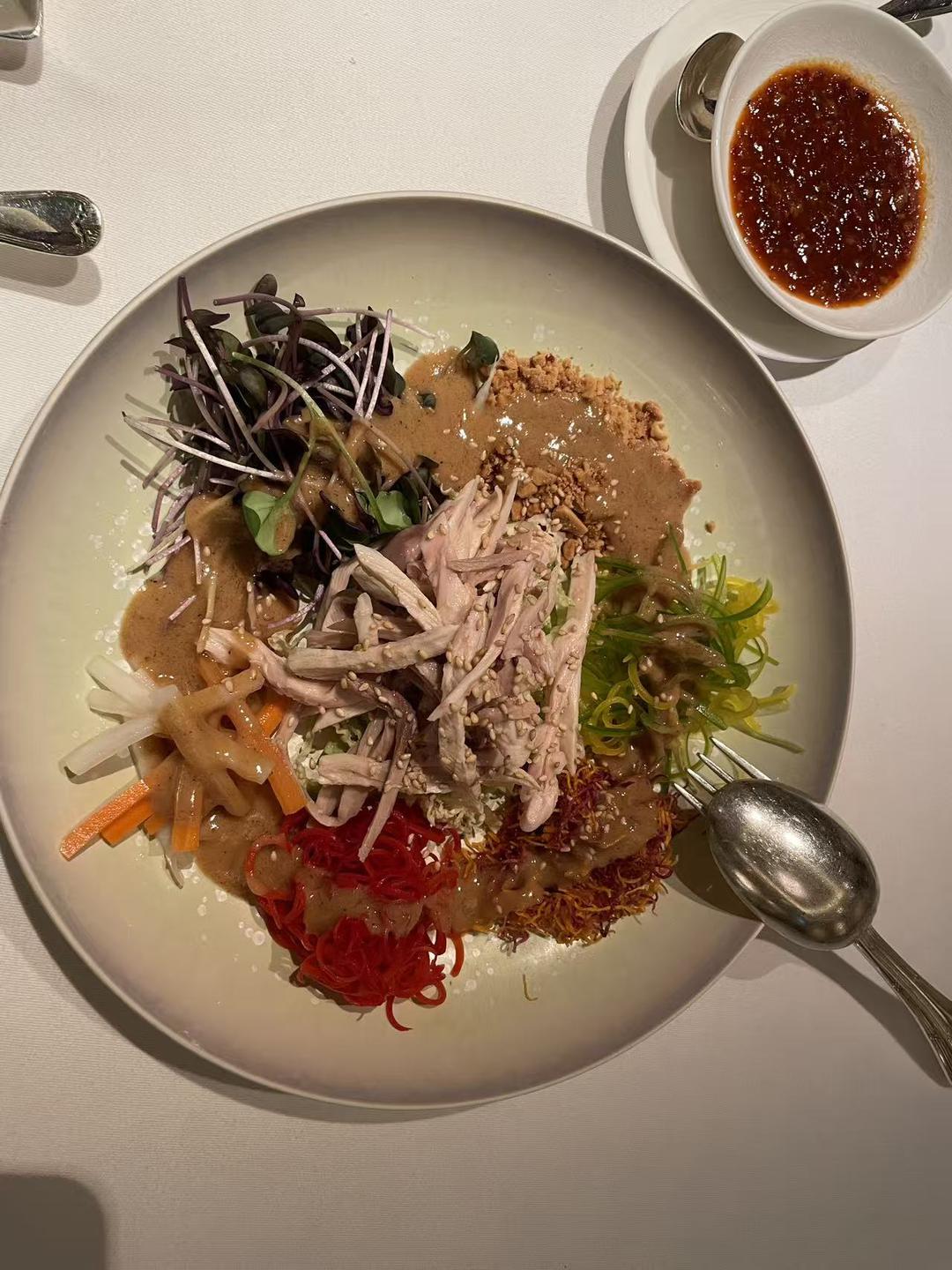 餐厅典雅沉稳,深木色屏风、青花瓷盘、柔和灯光。除了我们三人,整厅客人全是法国人。令人意外的是——他们用筷子的姿势极其标准,举手投足间从容自然,仿佛每天都在吃中餐。 侍者送上菜单,推荐几道主厨的代表菜:沙拉、鲜虾云吞汤、五彩蒸饺、明炉烧鸭、香宫炒饭、杨枝甘露……