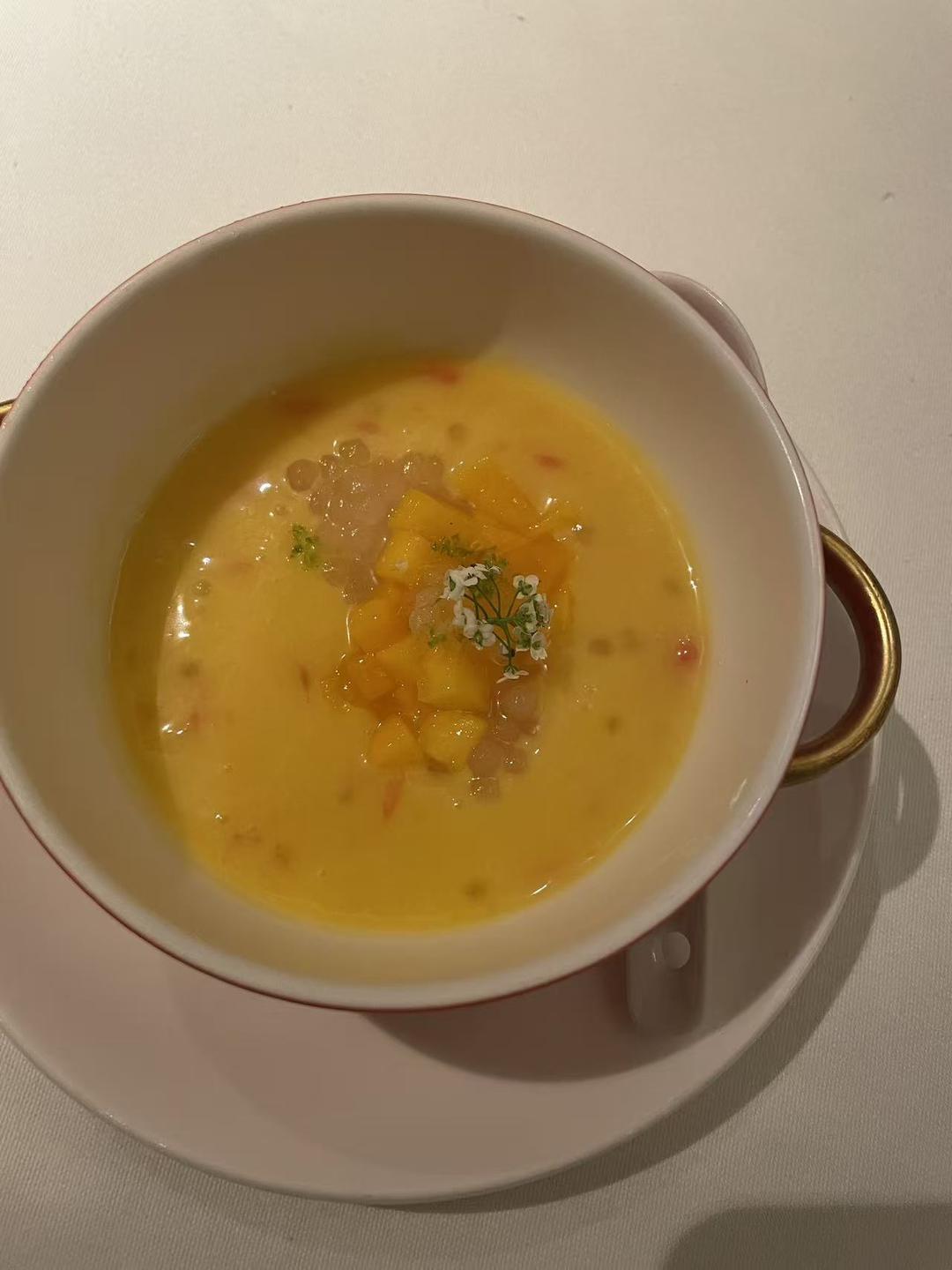 接着是明炉烧鸭。法国侍者推着雕花餐车到桌边,一位金发小哥现场切鸭。刀声干脆,鸭皮油亮。每片薄如纸片,大小一致。味道中式,呈现方式却完全法餐化。 香宫炒饭(Riz sauté Shang Palace)。米饭粒粒分明,鸡蛋、虾仁、青豆的比例精准。锅气浓却不焦,油香温和。看似家常,实则讲究。火候、湿度与盐度都被控制在极小的误差范围内。 甜点是椰香杨枝甘露。芒果、西米、椰奶分层装在玻璃杯里,顶部一片薄荷叶。甜度轻,椰香自然。是法式结构里的亚洲味道。