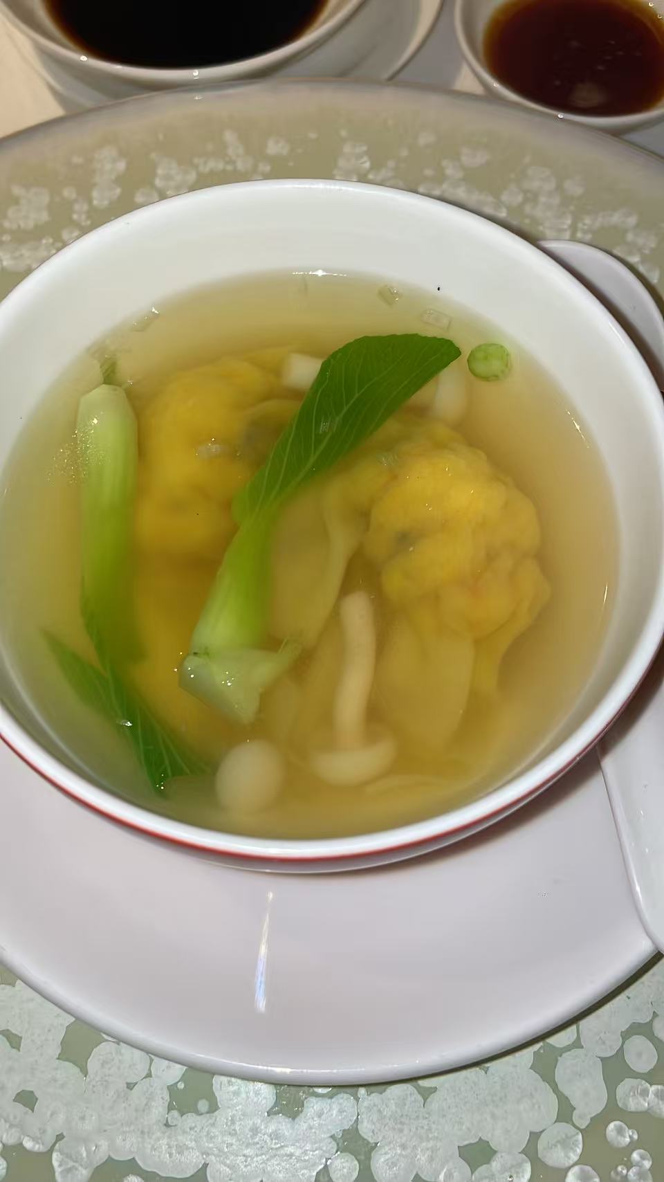 鲜虾云吞汤。汤清亮,云吞皮薄,虾肉紧实,两片碧绿的上海小白菜叶,加上几根细白菇,入口干净,鲜味直接。每一勺都能尝出厨师对火候与盐度的控制。