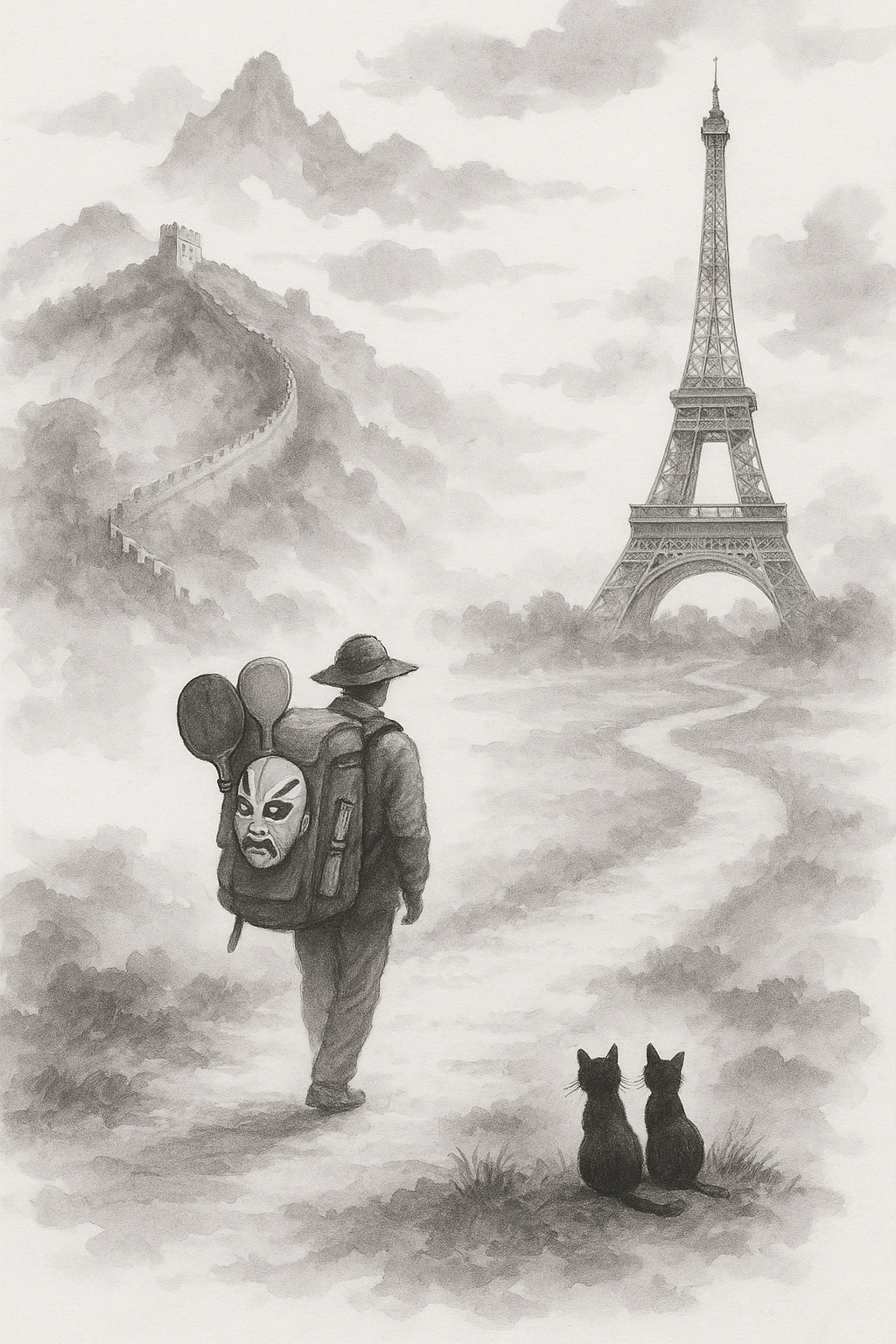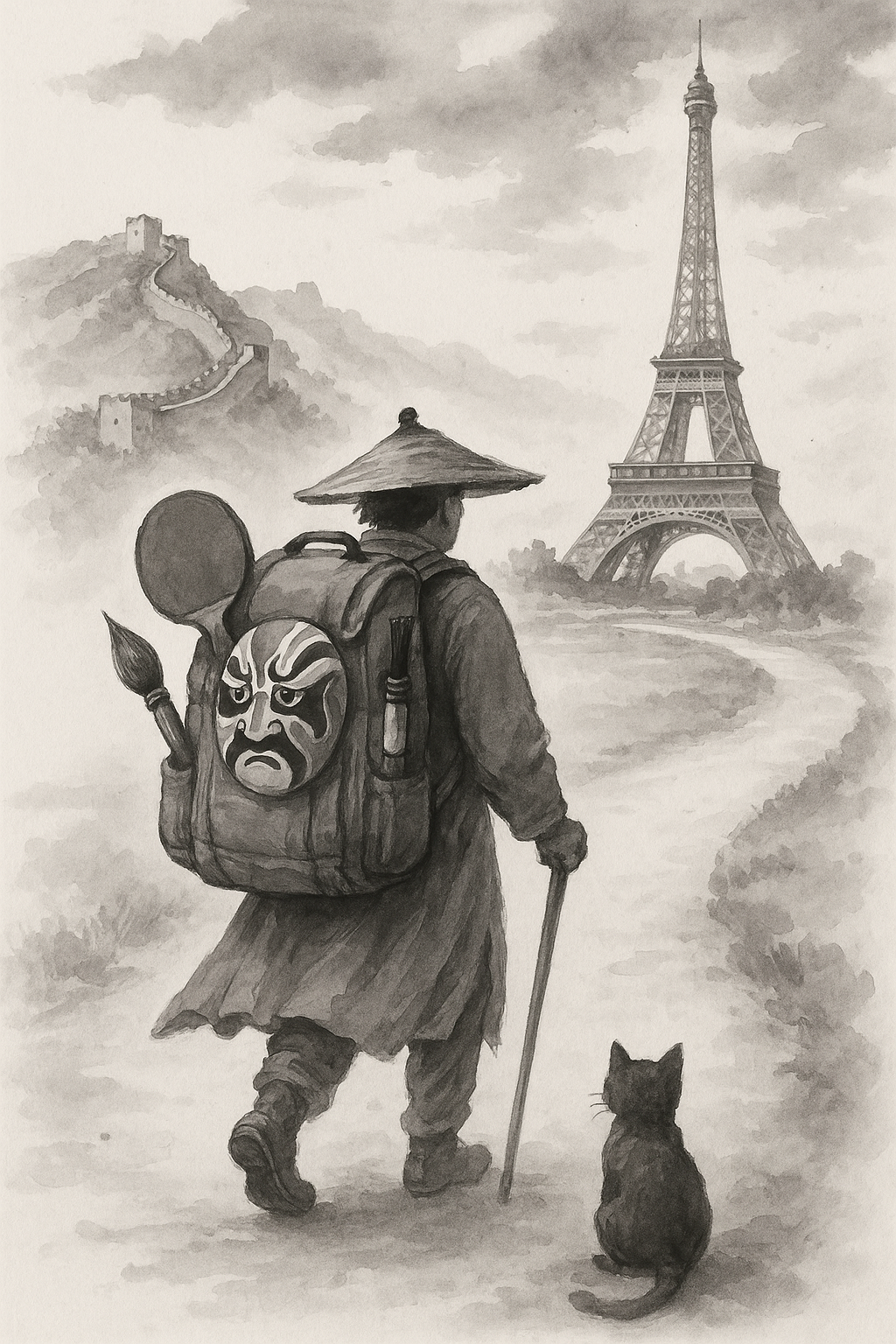 我每次想到这个封面,心里都在微微颤动:那位旅人,明明走在巴黎的天光下,却像从故乡的晨雾里走来。他背着的那只行囊,装的不是行李,而是精神的重量——一支毛笔、一副乒乓球拍、一张京剧脸谱。那是他心里的中国,是他不愿放下的文化乡愁……