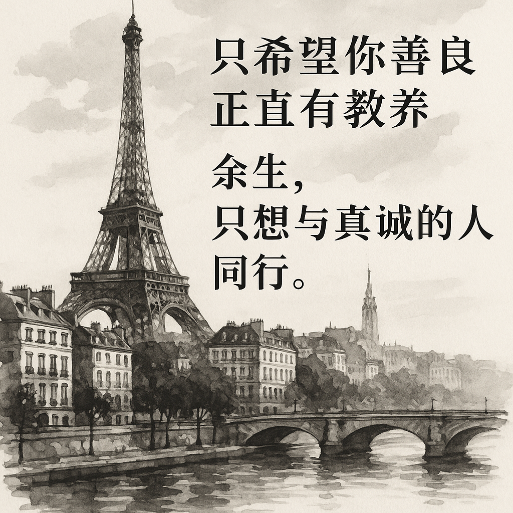 巴黎生活日记 我不求你完美,只希望你善良正直有教养。余生,只想与真诚的人同行(2025.11.8.) 人这一生,会遇见很多人。 有人光鲜亮丽,却让人心生防备;有人平凡低调,却让人倍感温暖。 我逐渐明白,真正能走进心里、走得长远的人,从来不是最耀眼的那一个,而是善良、正直、有教养的人。 善良,不是懦弱,而是一种选择。 在复杂的人情里仍愿意温柔待人,是一种难得的清醒。正直,不是固执,而是一种底线。它让人在人际的洪流中,依然挺直脊梁,不随波逐流。 而教养,是沉默的力量。它体现在一句“请”和“谢谢”里,也藏在不随意评判、不伤人自尊的分寸感中。 一个人若见过世间冷暖,却依旧保持善意与温度,那便是一种难得的成熟。真正的见过世面,不是眼界多高,而是心胸有多宽。 我喜欢那种人——不喧哗、不虚伪;懂分寸、懂感恩;在人群中自带光,却不刺眼。 他们让人相处时安稳、离开后怀念。 所以,余生很短,我不求你完美。 我只希望你心存善良,行事正直,懂得尊重与体谅。 因为在这个浮躁的世界里,真诚与教养,是人最珍贵的底气。