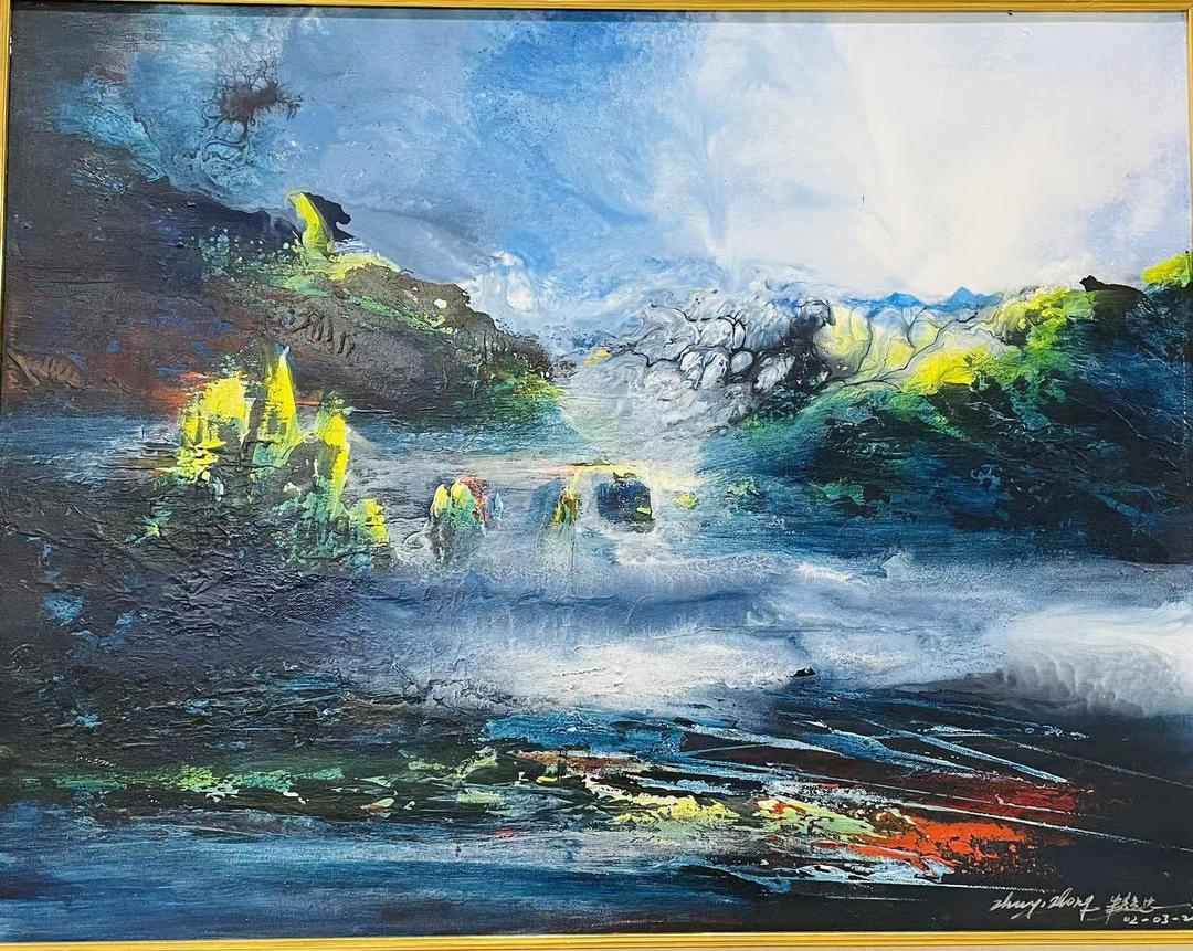 画面以蓝与绿为主调,笼罩着一层朦胧的光雾。远处的白光从画面右上方洒下,穿透山体与云层,柔和却有穿透力。前景的深蓝稳重而宁静,如梦的底色;中部的绿意带着生命的温度;而点点亮黄,则如思想的火花,在寂静中闪烁。朱毅中通过冷暖色的微妙交织,让整个画面流动着一种近乎音乐般的节奏感。 技法上,他以泼彩的自然渗化与厚涂的层叠构建空间。颜料的流动仿佛雾的呼吸,而刮擦与堆叠形成的肌理,又让山体与光线具备真实的触感。光的变化并非简单的明暗对比,而是一种“内在的发光”——似乎来自画面自身的心脏,带着温柔的力量,缓缓点亮整个世界。 这幅作品是一种“静默的苏醒”。它没有火焰的爆发,也没有风暴的撕裂,而是在静中显动、在梦中见光。那道柔光象征心灵的觉醒——当时间的流动与自然的呼吸重叠,世界仿佛获得了新的秩序。 在《寂静之光》中,朱毅中用色彩记录“存在的低语”。他以抽象的语言,描绘出生命由梦入醒、由夜入晨的过渡时刻。 那是万物最安静也最神圣的瞬间——光与梦共生,时间在呼吸。(来源:巴黎无忧画廊) 相关作品链接: 光与山的交响 朱毅中油画作品将亮相巴黎参加纪念抗战胜利80周年书画展 推广