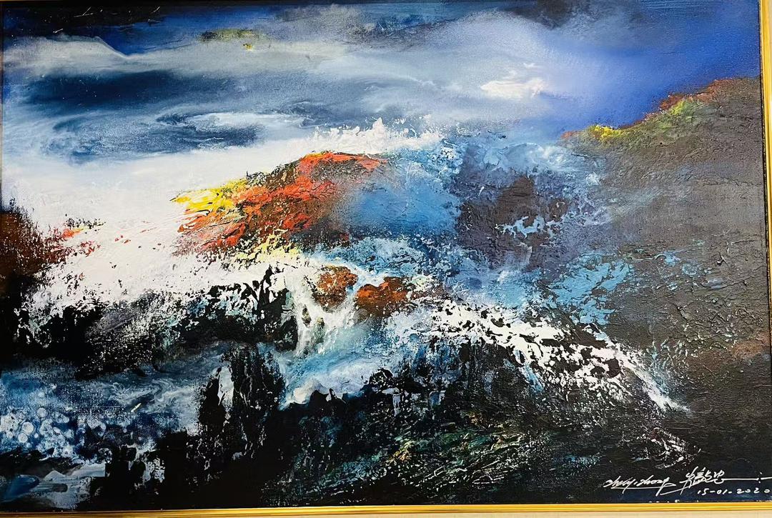 画面以蓝、白、橙红交织构成壮阔的能量场。下方的深蓝如海的根源,承载着沉默与力量;中部的橙红如火山喷薄,是大地的血脉在翻涌;上方的灰蓝与白光交融,象征天的意志与灵性的升腾。色彩之间没有明确界限,而是在对撞与融合中完成一种“创造的秩序”。那一抹突出的金黄,如雷霆击穿夜空,是天地初醒的闪电,是生命第一次的心跳。 朱毅中以泼彩的流动性结合厚涂的物质感,使颜料在画布上自然破裂、相融,如地壳在运动,如浪涛在咆哮。颜料在碰撞中生成复杂的肌理,形成从静到动、从暗到明的节奏。画面仿佛具有脉搏——一呼一吸间,光在生长,时间在扩张。 这幅画的核心不在描绘自然,而在于呈现“能量的形态”。光,是创造的起点;水,是生命的延续;火,是精神的觉醒。三者在画中汇聚,构成了宇宙最初的交响。 《光之爆裂——天地的第一声心跳》是一次对存在本源的凝视。 它让我们看到,在看似混乱的能量爆发中,隐藏着一种更高的秩序——那是生命的节奏,是天地第一次共鸣的律动。 当观者凝视这幅画时,仿佛能听见那低沉而宏大的震响: 那不是风的声音,也不是海的浪涛, 而是世界在光中第一次跳动的心脏。(来源:巴黎无忧画廊供稿) 相关作品链接: 光与山的交响 朱毅中油画作品将亮相巴黎参加纪念抗战胜利80周年书画展 推广