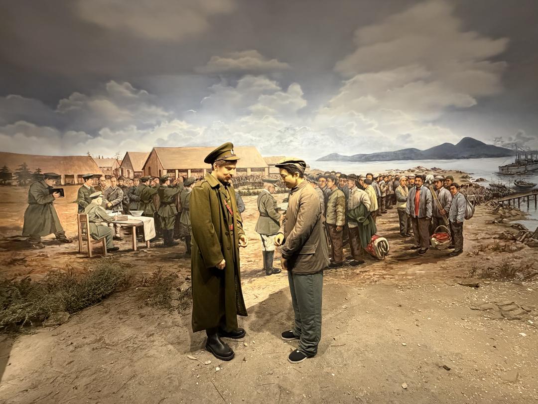 场馆内,“世纪大变局”“最佳招募地”“万里赴戎机”等五大展区层层递进,近200件文物静静诉说着14万华工的远征故事——刻有编号的铜手镯是他们的“身份凭证”,锈迹斑斑的帽徽见证了战场硝烟,泛黄的招募证件与勋章则凝结着血汗与荣光。其中,华工马秀新的录用证书、潍坊籍华工的《路往纪事》日记等珍贵史料,生动还原了华工从威海卫等招募地出发,漂洋过海参与战壕修筑、物资运输、战地勤务的艰辛历程。