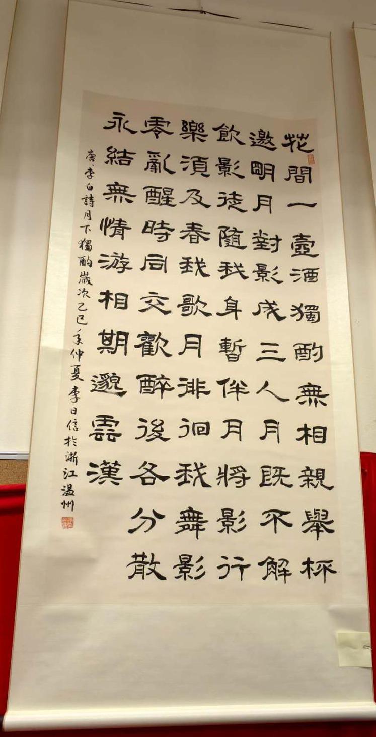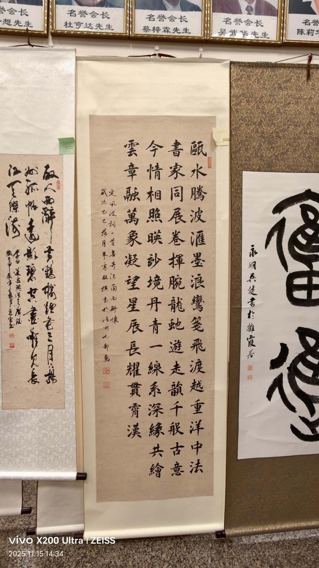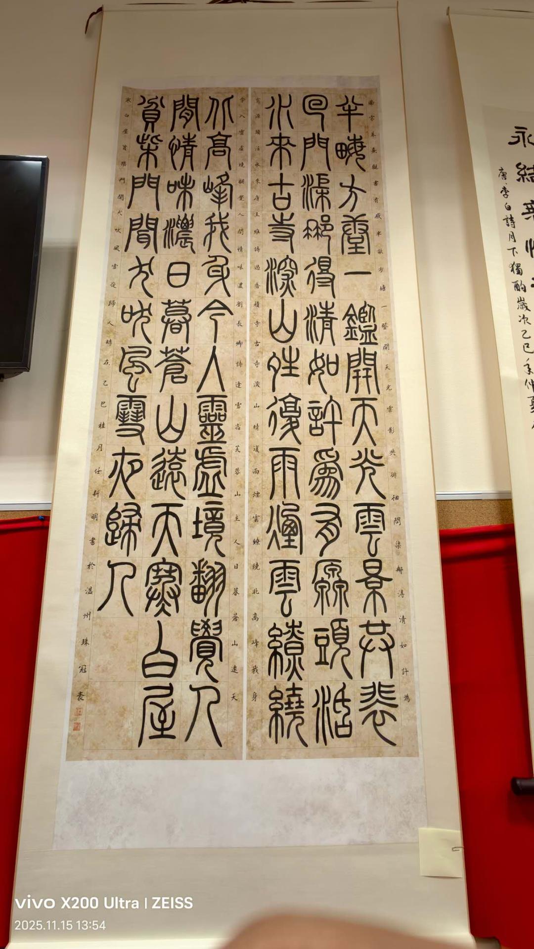 正文 2025年11月25日,在纪念中国人民抗日战争暨世界反法西斯战争胜利80周年书画交流展圆满落幕后,旅法侨界与中法艺术界朋友齐聚巴黎,共同庆贺温州城市大学青翰书画社执行社长徐锦雲带来的作品在本次展览中的精彩亮相,为中法文化交流再添浓墨重彩的一笔。 本次展览于11月15日在巴黎潮州会馆举行,来自法国、中国、西班牙、澳大利亚等国的百余位嘉宾出席,共同见证这场汇聚历史记忆与艺术精神的文化盛事。 在此次规模宏大的展览中,温州城市大学青翰书画社执行社长徐锦雲代表书画社携十幅作品赴法参展,其中包括87岁的老社员李日信、社长朱震旺等十位艺术家的欧楷及书画作品,全面展示了温州书画的艺术成就与文化底蕴。作品题材多元,涵盖篆书、行草、设色山水等形式,呈现出浙派笔墨清雅雄健、意境深远的艺术特色。