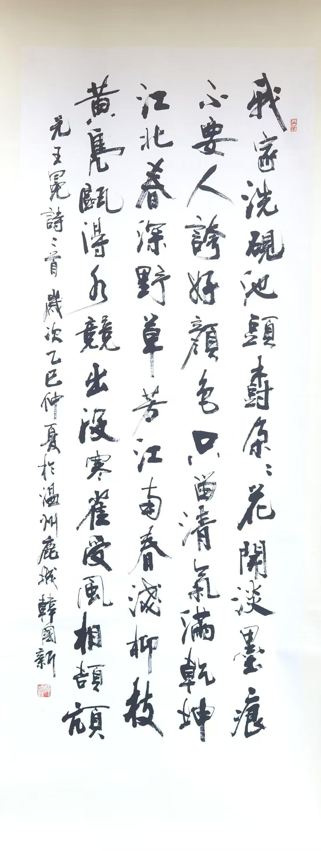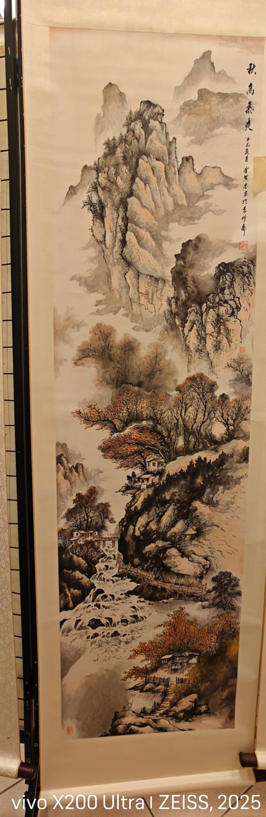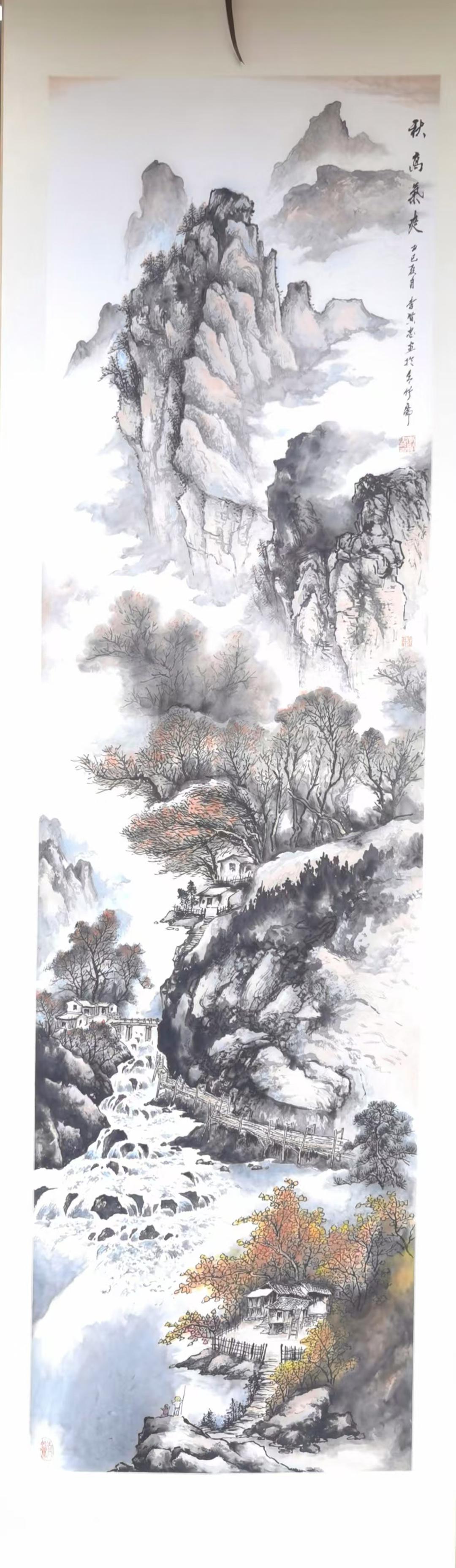 徐锦雲的草书作品古朴端庄、笔画圆融,,体现了“古韵为骨、清雅为魂”的温州书法审美。其草书作品笔势酣畅,行气连贯,在奔放中见法度,富有强烈的抒情性。绘画方面,他带来的秋景山水构图高远、笔墨沉稳,山石皴法老练,树木枯笔与淡彩相映,秋意温雅,溪流奔涌与山居宁静相得益彰,整体画风典雅清润,具有鲜明的江南诗意。