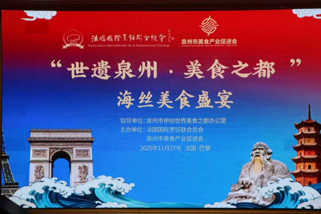 《法国华人头条》讯:(特派记者 志肖)2025年11月27日,由福建泉州市申创世界美食之都办公室指导,法国国际烹饪联合总会与泉州市美食产业促进会共同主办的“世遗泉州·美食之都”海丝美食盛宴,在巴黎国际大酒店精彩呈现。一场跨越时空与文化的美食之旅,让“泉州味道”在世界美食之都巴黎绽放光芒,吸引了来自中法各界的200余名嘉宾齐聚一堂,共享海丝文化与美食交流的盛宴。