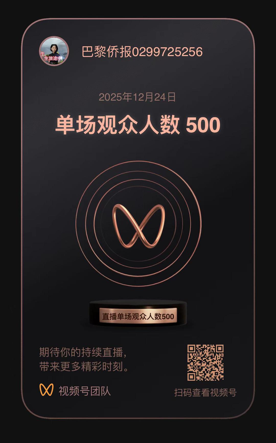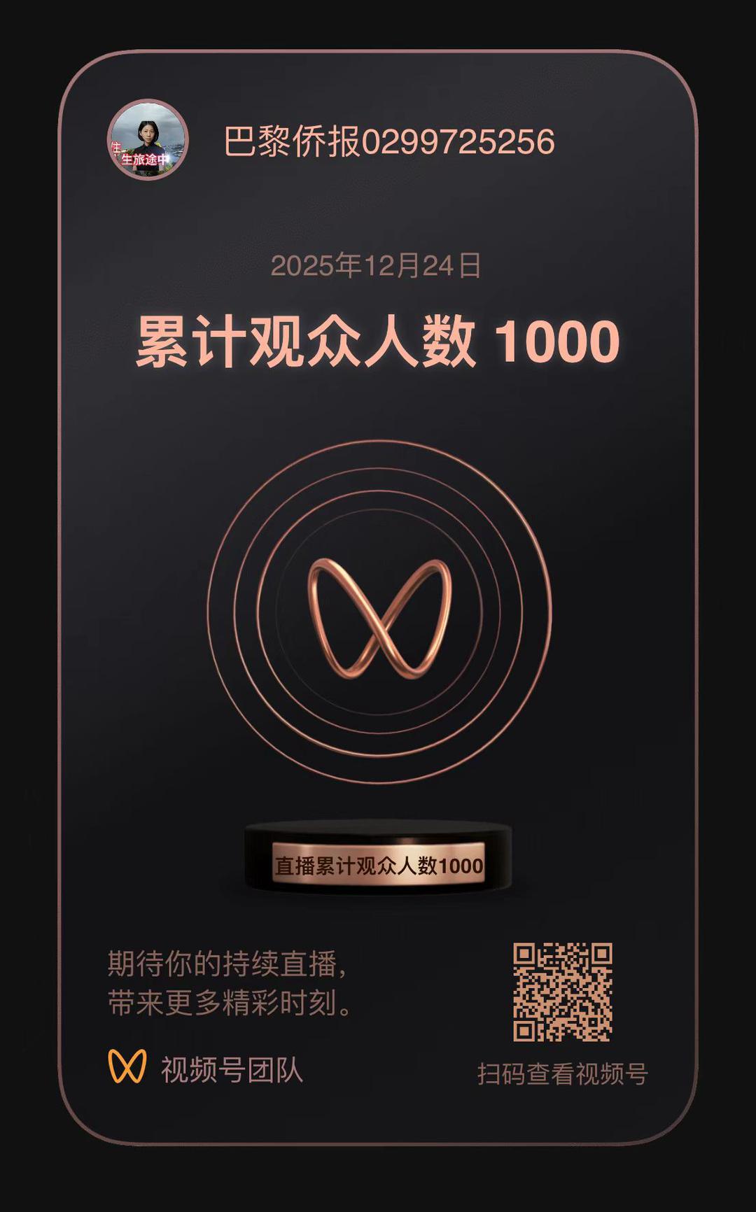 巴黎海芬日记(2025.12.24.)12月24日早晨,圣诞节的前夜。 刚刚睁开眼睛,手机上忽然跳出一条提示——微信视频号直播申请通过了。我一下子愣住了:怎么会这么快?申请时明明显示需要20个工作日,我原本以为,至少要等到1月中旬才会有结果。 没想到,惊喜在圣诞夜前悄然降临。 那一刻,心里的喜悦一下子被点亮。几乎没有犹豫,我立刻起床,决定把这份意外变成行动。泡了一杯咖啡,又泡了一壶茶,简单收拾后,便走向塞纳河畔——那里正是2024年巴黎奥运会开幕式举办的地方。冬日清晨的塞纳河安静而柔和,河水缓缓流淌,仿佛也在为这一刻见证。 直播开启后,温暖不断从屏幕另一端涌来。好久不见的国内朋友——袁教授的太太,一直在点赞、交流;法国进出口商会的老会长老夏,也走进了直播间。更让我感动的是,此刻他人在上海,却通过直播,与我一同站在巴黎的清晨。还有20多年前《杭州日报》的老同事、巴黎美丽又热情的小媚……认识的、不认识的朋友纷纷出现,屏幕这端的我,被一份久违的连接与陪伴深深包围。 惊喜很快接踵而至。开播不久,就收到了“单场观众人数超过500”的提示;