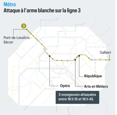 事发时间在当天下午16时左右。一名25岁的男子出现在巴黎地铁3号线上。这条线路连接巴黎东部和西北部,平日客流量较大。据警方调查,该男子在列车行进过程中突然掏出刀具,毫无预兆地袭击了一名女性乘客。受害者被刺伤后,男子迅速离开现场,继续在地铁系统内移动。 几分钟后,该男子出现在同样位于3号线的另一座车站,再次将目标锁定为一名女性乘客,并对其实施持刀攻击。第二名受害者受伤后,嫌疑人再次逃离。整个过程发生得极快,现场乘客来不及反应,只能在混乱与恐慌中报警求助。 在不到半小时的时间里,嫌疑人制造了第三起袭击。这一次发生在歌剧院附近的地铁站点,人流密集,情况一度十分紧张。第三名女性同样遭刀刺伤,现场留下明显血迹,目击者形容“场面令人胆寒”。至此,这名男子的连续行凶行为才暂时停止。 警方确认,三名受害者均为女性,伤势相对较轻,主要集中在背部和大腿。其中一名受害者还是孕妇,这一情况引发了社会舆论的强烈关注与担忧。一名当时在站台上的女性回忆说,虽然没有生命危险,但伤口很深,现场血迹明显,给人留下极大的心理冲击。 案发后,巴黎警方迅速启动应急机制。区域交通警务部门调取了大量地铁监控画面,对嫌疑人的行动路线进行还原和锁定。警方很快确认,这并非恐怖袭击事件,而更像是个人随机行凶行为,嫌疑人精神状态明显异常。 在嫌疑人试图通过换乘其他线路逃离时,警方已基本掌握其身份信息。通过手机定位技术,调查人员最终追踪到其位于巴黎郊区的住处。当晚19时前后,也就是最后一起袭击发生两个多小时后,警方在其家中将其成功抓捕,未再发生新的伤害事件。 检方透露,这名嫌疑人出生于非洲国家马里,曾因多起违法行为进入警方视线,主要涉及财产类犯罪。据警方内部人士称,他还涉嫌非法居留,并有性暴力相关前科,目前已被正式拘留,案件正在进一步调查中。(来源:巴黎人报) 推广