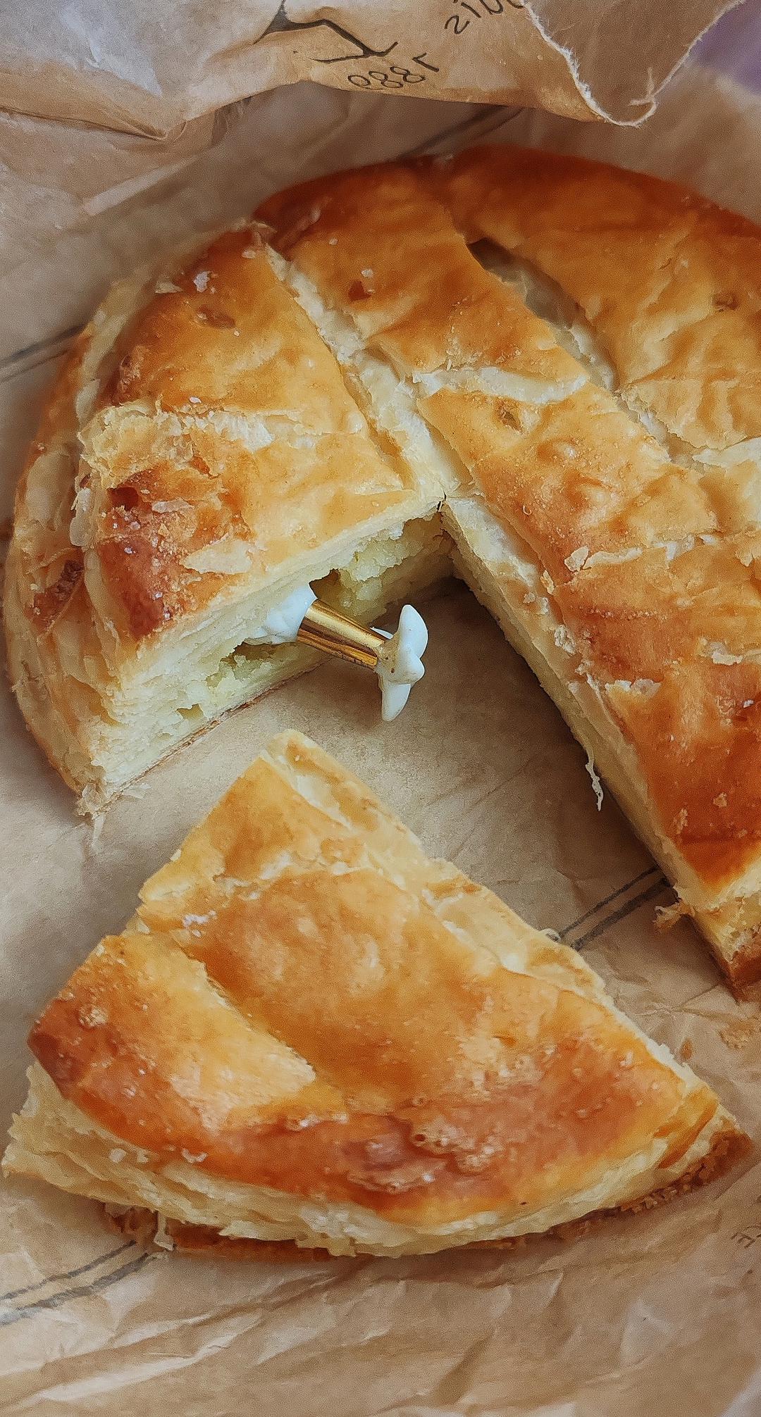 咱家的國王餅 國王餅是一個圓型的杏仁餡酥皮旦糕。其歷史可以追溯到古羅馬的農神節。 羅馬人在糕餅中放置一顆蠶豆,奴隸分吃到者可以享受「一日國王」的特權。 每年1月6日,是法國人天主教的主顯節,在此前後,大家會食用國王餅。紀念的是聖經中所記載,東方三聖朝見襁褓中的耶穌。 因為教會後來把羅馬人農神節吃國王餅這一傳統,與東方三聖朝見耶穌聯繫起來,把蠶豆換成了耶穌的小瓷像,在法語中仍稱為 「FEVE」。 現今的「FEVE」題材多樣,花草樹木鈔票都有。還有一頂硬紙金色王冠與國王餅一起出售,吃到小瓷像的人會被加冠,寓意幸福幸運。 法國總統也延續了這一傳統,由馬克隆主切,在愛麗舍宮與應邀嘉賓一同享用直徑超過一米的國王餅。 不過,這個「官方國王餅」內不含任何「FEVE」。因為在1789 年,法國已經結束了君主制。 馬克隆對這個國王餅傳統的延續,不僅是對文化的傳承與尊重,也讓民眾看到他親民的一面,正好藉此公開向社會各界恭祝新年快樂。 在咱家,切國王餅的儀式是,由家中長者主切,但卻是由家中最幼小的三歲小孩,決定切出來的那塊餅分給誰。大家紛紛向孩子使眼色,希望不要成為最後一個。 分到「FEVE」者,高聲歡呼,氣氛熱烈!吃過國王餅,即為慶祝新年節目畫下完美句號。