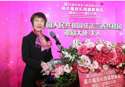 张华首先代表邓励大使及使馆对即将卸任的陈岚会长表示感谢,向新任会长胡丽蓉表示祝贺,并向旅法妇女同胞致以诚挚问候。