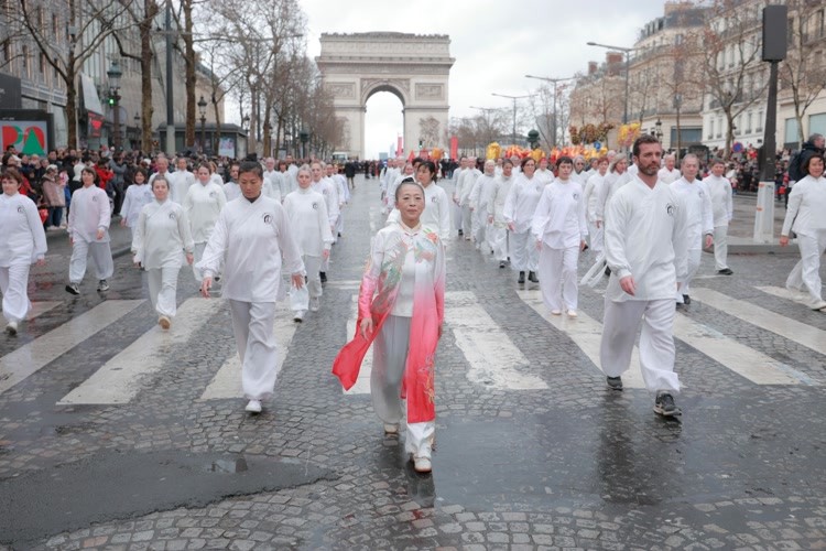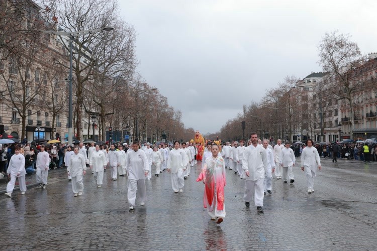 他们身着统一服装,步伐沉稳而整齐,神情专注而平和。在灰蓝色天空与湿润路面的映衬下,这支队伍散发出一种内敛却强大的东方气质,吸引了大量巴黎市民和来自世界各地游客的目光。