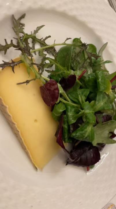 奶酪环节回归土地本身。农家手工圣内克泰尔奶酪配以混合嫩叶沙拉,质朴而真诚,是法国餐桌上不可省略的一段停顿。随后,黑森林蛋糕作为甜点登场,巧克力与樱桃的经典组合,为整场晚餐画上温和而克制的句号。