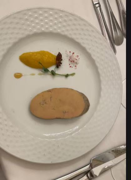 晚宴以开胃酒开启。香槟轻盈细致,气泡在杯中缓缓升起……佐以果汁与苏打水,宾客在低声交谈中完成从公共空间走向餐桌的过渡——这是法式礼仪中不可或缺的节奏。 酒水的选择延续了对风土的尊重。来自加斯科涅丘的 Domaine de Joy 白葡萄酒,清新而不张扬;波尔多梅多克贝勒格拉夫城堡的红酒,则沉稳、内敛,与正式场合相得益彰。Castalie 矿泉水静水与气泡并置,仿佛提醒人们,克制同样是一种品味。 前菜是利马涅平原的半熟鸭肝。质地柔润,入口即化,搭配香橙叶风味的芒果酸辣酱,酸度轻巧,恰到好处地唤醒味觉,却不抢主角风头。这种平衡,正是法式料理的灵魂所在。
