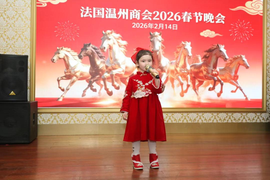 他高度评价法国温州商会多年来秉持“服务侨胞、回馈社会”的宗旨,在促进中法友好往来、搭建交流平台方面发挥的重要作用。他指出,团结是侨社行稳致远的坚实力量,希望广大侨胞继续发扬温州人敢闯敢拼、勇于创新的精神,以更加昂扬的姿态投身事业发展,为中法交流合作贡献更多侨界智慧与力量。 在阵阵掌声与欢笑声中,晚会进入文艺表演与晚宴环节。 恰逢浪漫情人节,李云亭会长携商会骨干成员向现场每一位女士赠送了一朵红玫瑰,现场花香四溢、温情满满,将节日的祝福与尊重化作最真挚的表达。 女声独唱《节日欢歌》由吴风倾情献唱;童声独唱《小美满》由小天使Gloria温暖呈现;倩倩舞蹈团带来的现代舞《初跃》,以轻盈灵动的舞姿演绎青春与梦想的飞跃;男中音贾一然深情演绎《长江之歌》,雄浑大气的歌声激荡起游子心中奔腾不息的母亲河情怀。舞蹈《美丽的姑娘》柔美绽放:情人节特别献唱《你是我的玫瑰花》将甜蜜氛围推向高潮。晚会最后由旅法著名女高音歌唱家周虹倾情演唱《我为和平、友谊而歌唱》,以跨越国界的艺术力量传递和平与友谊的美好愿景。 中法混血儿格格在现场演唱歌曲《小美满》赢得满堂喝彩!