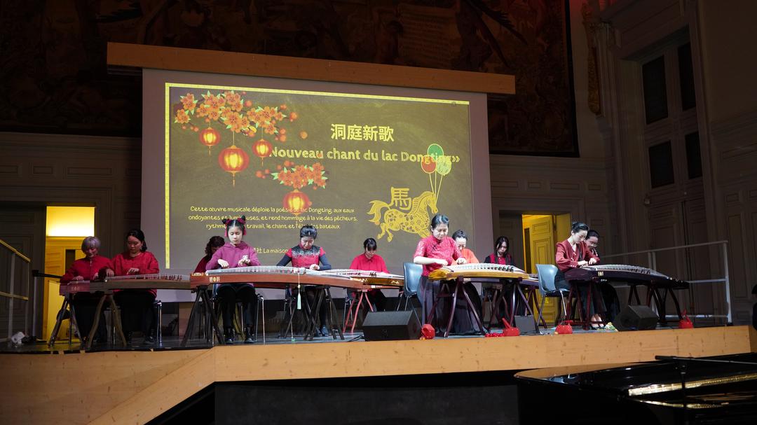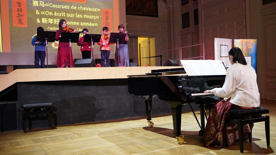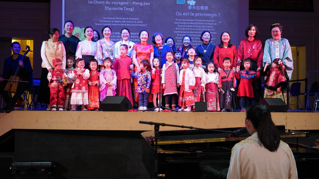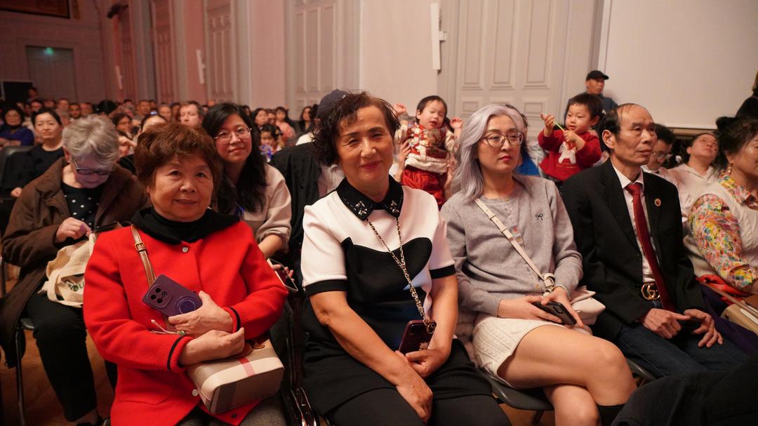 孩子们精神饱满地登台亮相,瞬间点燃全场热情。《恭喜恭喜》唱出新春祝福,将晚会气氛迅速点燃。现场主持人小茉走下舞台,来到观众席间,一遍遍带领中法观众打着节奏齐声唱出“恭喜恭喜”的旋律。她挥动双手示意,全场观众跟着节拍鼓掌合唱,笑声与歌声交织在一起,气氛热烈非凡。台上台下融为一体,连巴黎13区区长顾梅也一边打着拍子轻声跟唱,一边拿起手机记录下这温馨而珍贵的瞬间。那一刻,音乐跨越语言与文化的界限,让整个礼堂洋溢着浓浓的年味与欢乐。 《游子吟》《春天在哪里》以亲子诗歌吟唱与合唱形式温情呈现,父母与孩子同台互动,画面温馨动人。马头琴、钢琴、长笛与童声交织,东西方乐器碰撞出别样火花,现场掌声不断。 “成语拜年”节目成为全场焦点。十多位萌娃用响亮清晰的中文成语送上祝福,既有传统韵味,又充满童真活力。古筝合奏《洞庭新歌》余音袅袅,脱口秀轻松幽默,《赛马》《新年好》活力四射,《如愿》三重唱温柔动人。