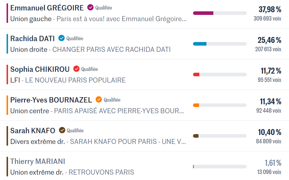 在左翼阵营中,社会党的埃马纽埃尔·格雷戈瓦代表现有市政多数派,被视为接班人;而极左翼不屈服的法兰西党的候选人”的索菲亚·奇基鲁则试图搅局,推动激进左翼崛起。 在右翼阵营中,拉希达·达蒂(共和党)是现任市政府最主要的反对者。但皮埃尔-伊夫·布尔纳泽尔——获得马克龙“复兴党”与“地平线党”支持——正与达蒂争夺这一位置,并宣称将在第二轮选举中成为“造王者”。 在极右翼阵营中,“重征党”(Reconquête!)的莎拉·克纳福与国民联盟(RN)的蒂埃里·马里亚尼胜算不大,但他们将此次选举视为展示存在感、融入巴黎地方政治的重要契机。 |