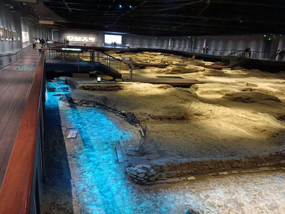 慈福宫正殿对面,朱炳仁用铜重塑的《千里江山图》以一场跨越千年的“丹青对话”来诠释现代美学。画高1.2米、宽14米,这幅画在青绿的基础上添加了红色,增加了其寓意,让《千里江山图》的再创作更具历史文化厚度,是德寿宫遗址博物馆很重要的一件艺术品。 宋徽宗时期的旷世佳作《千里江山图》,作者“希孟”是中国艺术史上“谜一样”的存在,可以用极度的才华与极度的神秘来形容。他成为了中国绘画史上一个永恒的谜,这个谜很难打开,但正是这种“留白”,给了后人无限的遐想空间。此画真迹纵52.5厘米、横1191.5厘米,现珍藏在北京故宫博物院。 最后移步来到慈福宫及相关苑囿遗址区域。该遗址是迄今发掘面积最大、规格最高、揭露遗存最丰富的一处南宋皇家宫殿园林建筑遗址,前后历时二十余年。 总揭露面积近7000平方米,发现了各历史时期类型丰富的考古遗迹,其中包括宋孝宗时期中轴线上的重华殿及西区慈福宫等重要建筑遗址、能确定德寿宫基址范围的宫墙遗址,以及揭示南宋皇家园林“叠石理水”意境的水闸、方池、假山、亭榭等遗址。