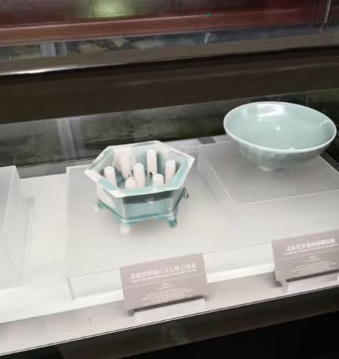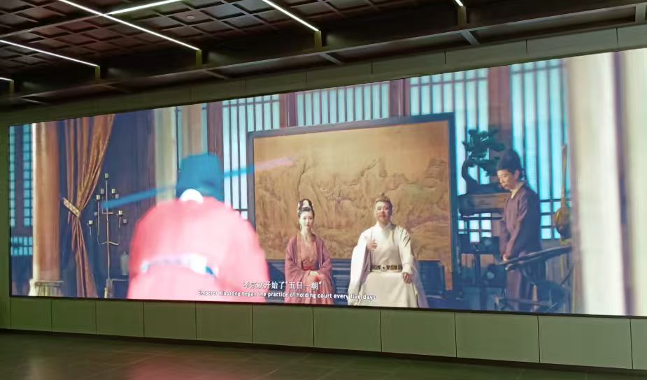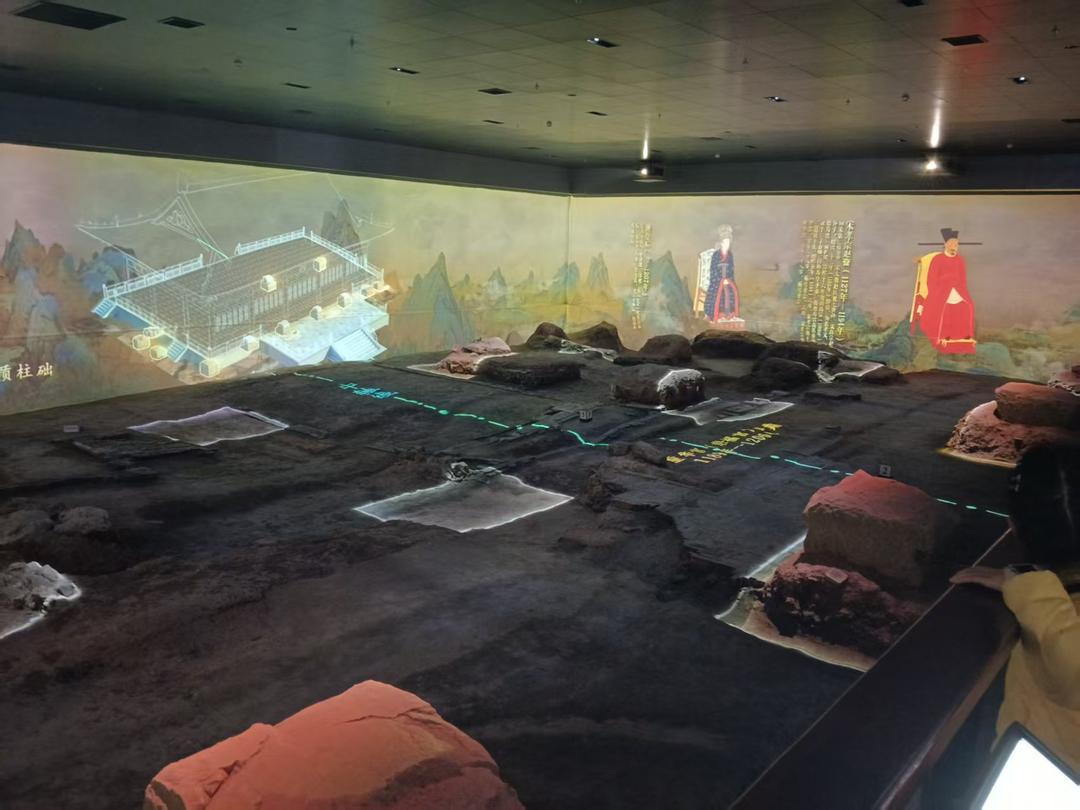 宋末三杰展区:指的是在国家面临覆灭的危难关头,奋力抵抗元朝入侵的三位忠臣:文天祥、陆秀夫、张世杰。这三位英雄以武勇和坚韧奋战至死。他们共同构成了南宋王朝最后的脊梁,名垂青史。 转至地下一层重华殿遗址保护区域,该区域每天定时播放大型环幕电影。我第一次观看,就像是在看烟花,被绚丽的画面吸引,凑个热闹。第二次观看,看懂了一点当时建造德寿宫、重华宫的一些介绍,以及遗址地基等考古事项。 再次前往观看,比前两次要仔细一点。影片以磅礴大气的青绿色《千里江山图》拉开序幕,整个古杭州城展现在眼前,就像无人机视角在空中俯瞰,尤为壮观:左边西湖,中间城市,右边钱塘江,略过繁华城市街道,到达德寿宫全景图的展现,告知其地址、规模、布局。银幕通过光电闪烁指引,逐一介绍夯土台基、磉墩柱础、十字拼花香糕砖路面等遗址细节。再用高科技把红色立柱投影到磉墩柱础上,在遗址上呈现出3D立体视觉的重华宫,观众身临其境,仿佛穿越回800年前的大宋。