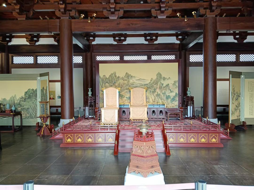 步入大殿,正中有两把龙椅,一把为“退休”皇帝座椅,另一把为赵眘皇帝座椅。宋高宗赵构身体有疾病,不能生育,赵眘是赵构的养子。赵眘是宋太祖赵匡胤的七世孙,他即位后,皇权回归正统。前面讲的他把德寿宫改为重华宫,也与借鉴古代尧舜禅让有关。
