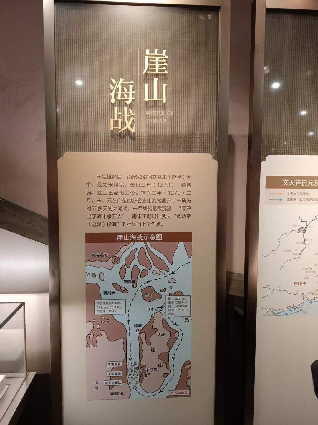 出土遗物共计6696件(组),其中陶瓷器5784件。另出土砖瓦、脊兽等建筑构件368件,石质文物71件,动物骨骼及骨器151件(组),铜钱207件(组),金银器等金属文物65件,漆木器34件,料器16件。 德寿宫遗址的发掘,不仅体现了宋代中国园林与建筑的最高水平,也是南宋临安城遗址保护的重要一环,在历史、艺术和科学上具有重要的研究价值。 崖山海战:宋、元两军在广东新会崖山海域展开了一场历时20多天的大海战,宋朝10余万将士战死海疆,壮烈殉国。在这场惨烈的战役中,无数英雄将士舍生忘死,为了保卫家园,他们义无反顾地冲向敌军,他们的鲜血染红了大地。崖山之战见证了大宋王朝的悲惨落幕,也见证了中华民族不屈不挠的精神。