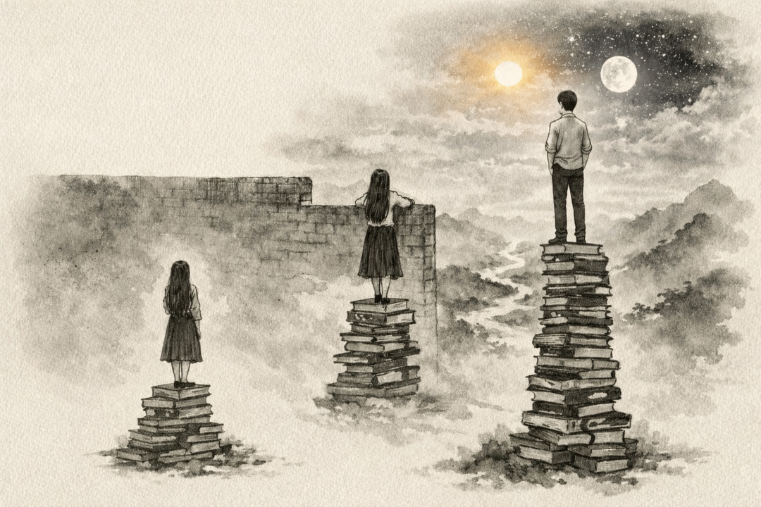 世间的人其实都一样:从娘胎里睁开眼睛,最初看到的,都是一片混沌。我们并不知道世界有多大,人有多复杂,历史有多深,未来又有多少种可能? 后来慢慢长大,开始认字,开始读书,也开始一点点认识这个世界…… 书读得少的时候,人最容易觉得自己已经懂了。懂几句道理,知道几个故事,就以为世界不过如此。再多读一些,眼界宽了一点,见识多了一点,又会觉得自己更了不起。 可真正读到一定程度,一个人才会渐渐安静下来。因为他终于看见:原来个人如此渺小,历史如此漫长,人性如此复杂,世界远比自己最初想象的更辽阔。也正因为看得更远了,人才会变得更谦卑。 这正像那两幅图。第一幅图里,几个人站在不同高度的书堆上,看向同一堵墙。站得低的人,只看见墙;站得高的人,已经看见了墙外。 第二幅图里,书被一层层垒高,像一条通往高处的路。它们都在告诉我们:人与人真正的差别,很多时候不在脚下的路,而在眼里的世界。 很多人以为,读书只是为了知识、学历和体面的谈吐。可读书更深的意义,从来不是让人知道得更多,而是让人看得更远。知识只是积累,眼光才是沉淀;知识让人会说,眼光让人会看。 书读得少,容易被眼前困住;书读得多,才知道眼前从来不是全部。一个真正读过书的人,未必更张扬,往往反而更谦逊;未必更急着证明自己,却更能理解别人,也更能安放自己。