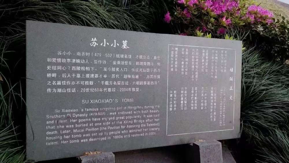 好景不长,阮郁父亲得知儿子与歌伎相恋,以病重为由将阮郁骗回京城,将其软禁。苏小小在西泠桥畔苦苦等待,期盼那匹“青聪马”能再次出现,但直到她因病去世,也没能等到阮郁的归来。断桥不断肝肠断用于西泠桥好像比用在断桥更为贴切。 漫步在西泠桥上,可以看到桥畔的慕才亭和苏小小墓。这座六角攒尖顶的亭子,柱子上刻满了历代文人墨客吟咏苏小小的楹联,成为西湖边楹联最多的亭子。我挑一副楹联读一下:桃花流水杳然去,油壁香车不再逢。