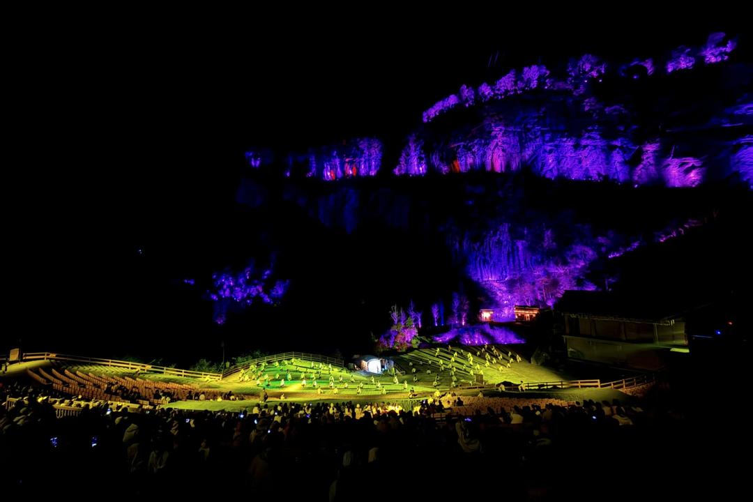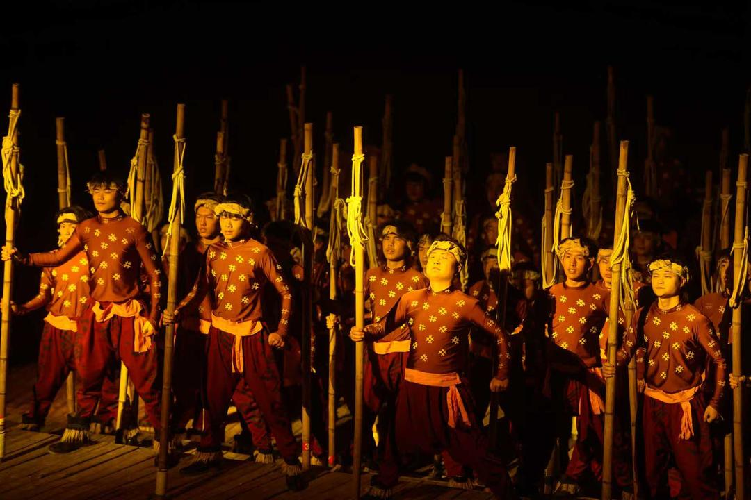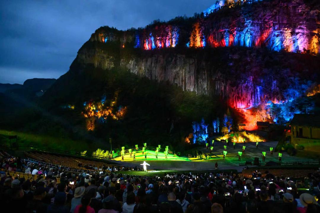 《印象·武隆》以国家级非物质文化遗产“川江号子”为核心主题,通过声、光、电等现代舞台科技手段,将武隆喀斯特世界自然遗产的壮美山水与浓郁巴渝风情巧妙融合,在70分钟演出中,为观众呈现出一场极具冲击力的视听盛宴。没有传统舞台的边界,没有刻意雕琢的布景,巍峨山峦、浩荡长风、幽深峡谷,共同构成了最恢宏的演出空间。川江号子的苍劲高亢,仿佛带领观众穿越时空,走进纤夫与船工搏击风浪、踏浪前行的岁月深处。 一声声号子,不仅再现了川江船工艰辛劳作的生活场景,也传递出巴渝儿女坚韧不拔、乐观豁达、吃苦耐劳、积极向上的精神力量。它既是一段逐渐远去的历史回响,也是一种跨越时空的文化传承,让观众在感受艺术震撼的同时,完成一次触及心灵的精神共鸣。