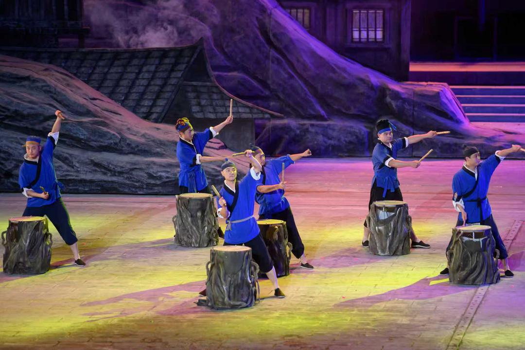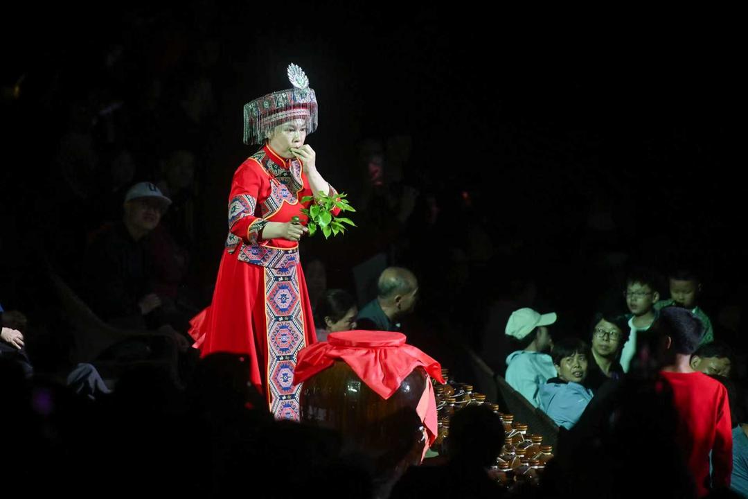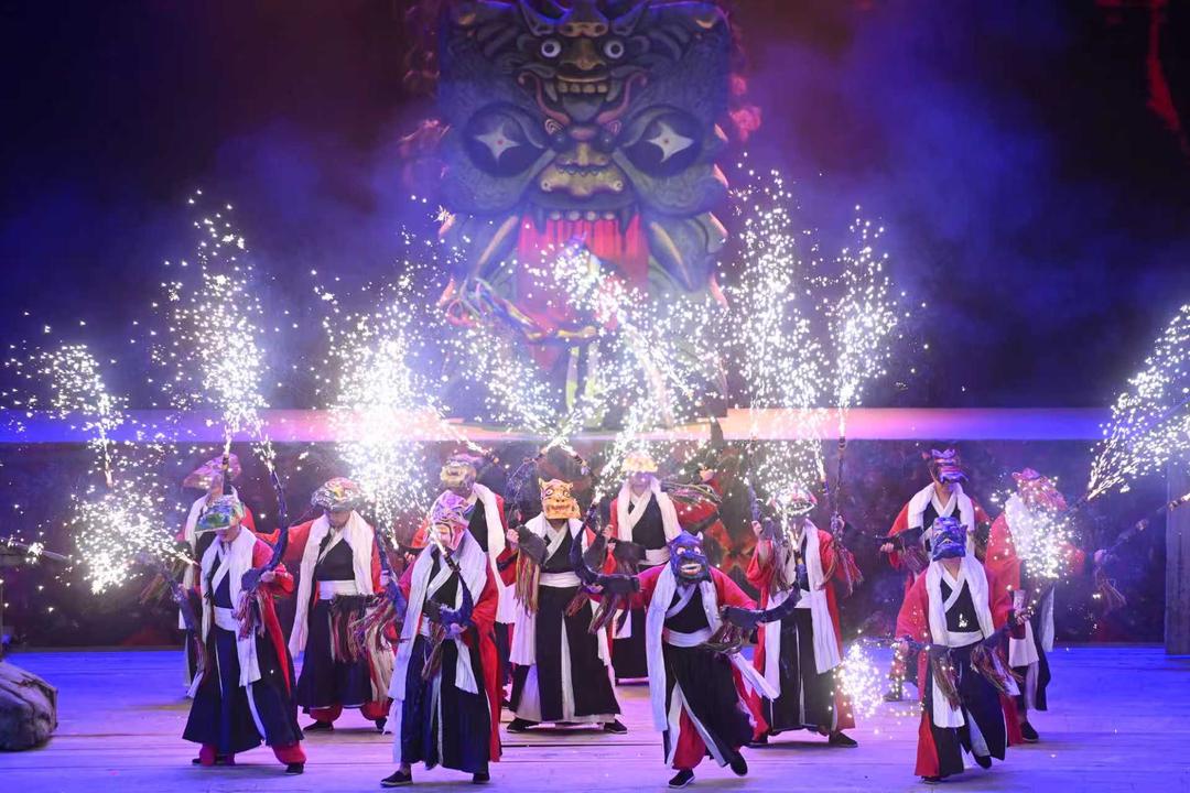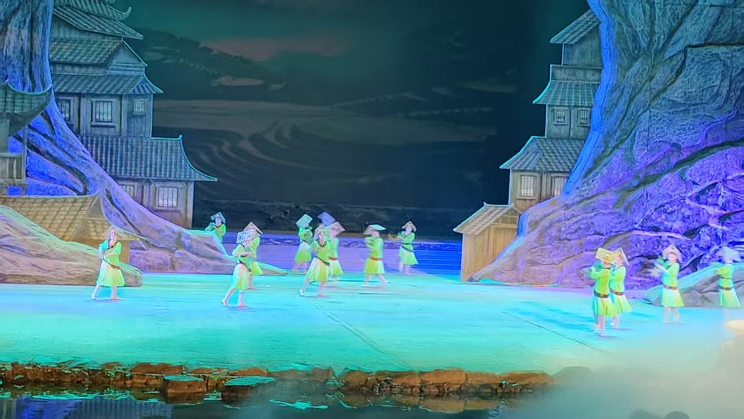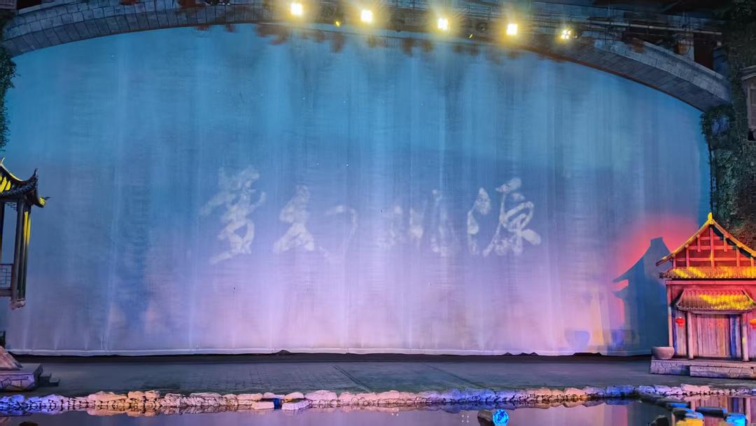 此次参访的一大亮点,是大型实景音画诗《梦幻桃源》。这是全国唯一以《桃花源记》为主题的实景演出,也是酉阳桃花源景区的重要文化配套项目。全剧时长约60分钟,分为五大篇章,以一位书生避乱误入桃源为主线,将梯玛神歌、茅古斯、木叶情歌、土家哭嫁、摆手舞等非遗民俗巧妙融入剧情之中。
