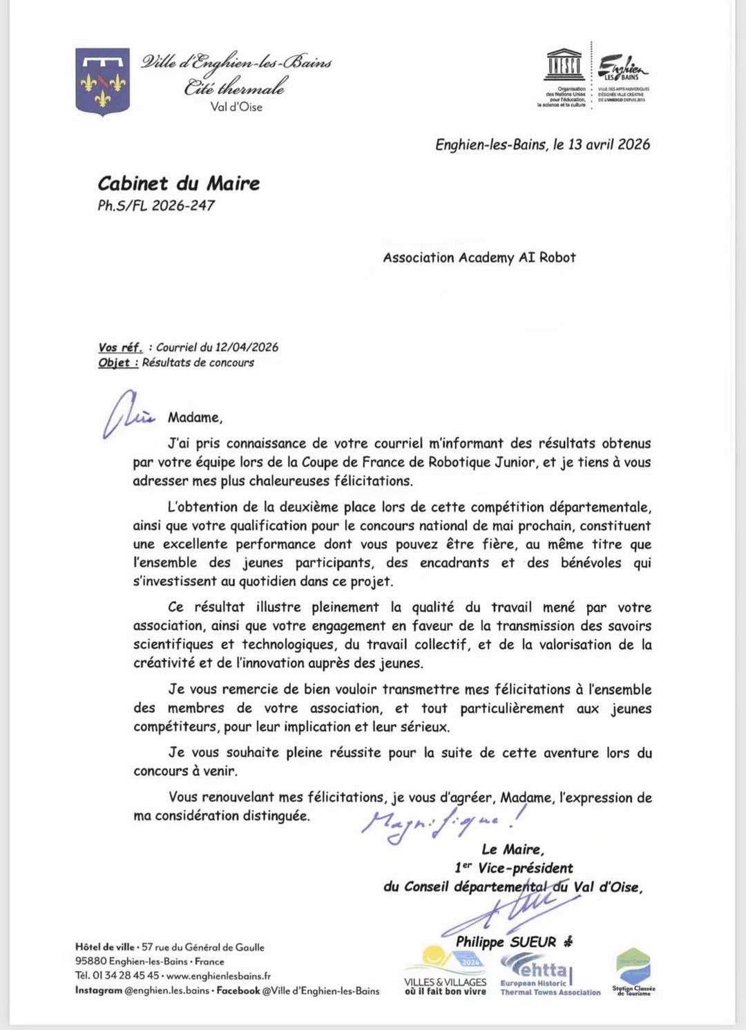 刁蕾表示:“这四年,我们用家庭的投入、持续的陪伴和扎实的技术支持,陪伴孩子们从零起步,一步步走到了今天。接下来,我们希望把这份经验延伸出去,让更多孩子有机会接触真正的工程教育。” 从未能入围,到大区亚军;从兴趣启蒙,到技术突破;从一支家庭支持下成长起来的华人青少年队伍,到受到更多关注与期待的工程教育团队,Academy AI Robot的故事,不只是一次比赛成绩的突破,更是一群孩子和家庭用坚持、热爱与协作共同写下的成长答卷。 附当地市长贺信: 2026年4月12日来信 女士: 我已收到您于来信中告知贵团队在法国青少年机器人杯比赛中所取得的成绩,谨向您致以最诚挚的祝贺。 贵团队在此次地区级比赛中荣获第二名,并成功晋级即将于5月举行的全国比赛,这是一项令人瞩目的优异成绩。对此,不仅您本人值得骄傲,所有参与其中的青少年选手、指导人员以及长期投入该项目的志愿者同样应当为此感到自豪。 这一成绩充分体现了贵协会工作的高质量,也展现了您在推动科学与技术知识传播、倡导团队合作精神,以及激发青少年创造力与创新能力方面所做出的努力与贡献。 烦请您将我的祝贺转达给协会全体成员,尤其是参赛的青少年选手,感谢他们的投入与严谨付出。 衷心祝愿贵团队在即将到来的全国比赛中再创佳绩,取得更大成功。 再次向您表示祝贺,并请接受我最诚挚的敬意。 此致 市长 菲利普·叙尔(Philippe Sueur) 市政厅地址: 电话:01 34 28 45 45 |