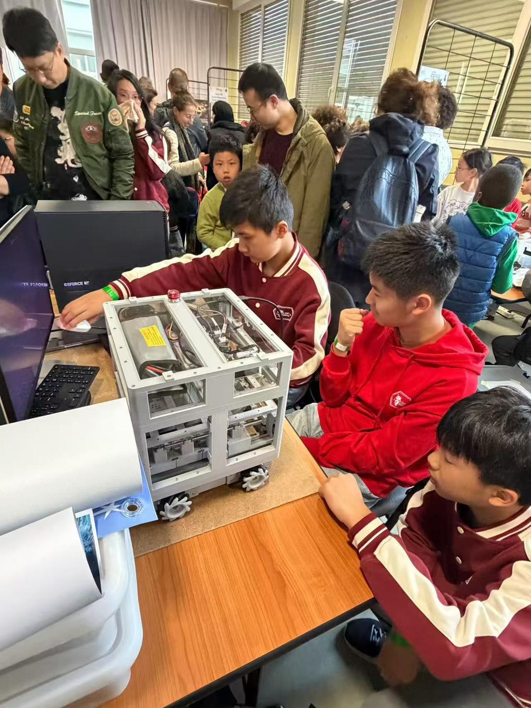 参赛队伍需要使用Raspberry Pi、Arduino、STM32、Micro:bit等专业主板,结合金属、木材、塑料、激光雕刻、3D打印等多种材料与工艺,自主完成机器人的设计、加工、组装与调试。在软件层面,选手还需要掌握C/C++、Python、ROS等专业编程语言和技术框架。换句话说,这不仅是一场比赛,更是一场面向真实工程体系的综合实践。 也正因为如此,Academy AI Robot此次在这一顶级赛事中夺得大区亚军,并荣获技术奖,显得格外耀眼。尤其是技术奖,并不单纯依据比赛名次评定,而是由评审团从技术创新与原创性、技术实现质量与可靠性、符合性与安全、功能完整性与性能、美观与呈现五个维度综合考核,是对机器人整体技术实力和系统完成度的直接认可。据团队介绍,Academy AI Robot还是本届大区赛中唯一获得这一技术奖项的队伍。 而这份成绩,并非一朝一夕得来。四年前,这支队伍第一次参赛时,甚至连大区赛初选都未能通过。第二年,他们前进到巴黎大区二十多名;第三年,提升至巴黎大区第七名,并在全国总决赛中取得第二十多名;直到今年,终于实现飞跃,拿下巴黎大区第二名和技术奖。这是一条从无到有、从弱到强的成长之路。 四年来,团队始终保持每周训练,持续推进技术迭代。机器人的研发从第一代一路升级到第四代;编程能力也从最初的图形化学习,逐步进阶到C/C++底层控制、ROS机器人操作系统、Python视觉识别等更专业的技术体系;机械结构则从塑料积木,逐步演进为工业级铝型材、3D打印定制零件和激光雕刻结构件。每一次升级,都是一次扎实的工程积累。 这份坚持的背后,是多个家庭四年来持续不断的支持与投入。几乎每个周日,四五个家庭、二十多位大人和孩子都会聚在Louis家中。孩子们一起研究机器人、调试程序、组装结构,家长们则彼此协作、交流经验,给予全方位支持。即便是假期,训练和备赛也常常照常进行。 据介绍,Louis家长期为团队提供训练场地、设备和活动空间。孩子们在高强度训练之余,还能在院子里放松活动,打乒乓球、健身,甚至体验索道、小森林等设施。这个家庭不仅提供了物理空间,更投入了大量时间、精力和心血,成为团队一路成长的重要支撑。 四年的训练,也让孩子们收获的远不只是技术本身。他们从零基础出发,逐步掌握代码编写、3D设计与打印、机械原理、模块设计和手工搭建等能力;更重要的是,在一次次备赛、调试、攻坚和并肩作战中,他们建立起了深厚的友谊。一起解决技术难题,一起熬夜调试,一起在压力后放松欢笑,这些经历让他们不仅成为队友,更成为彼此信赖的伙伴。 在这支队伍背后,还有两位关键人物。