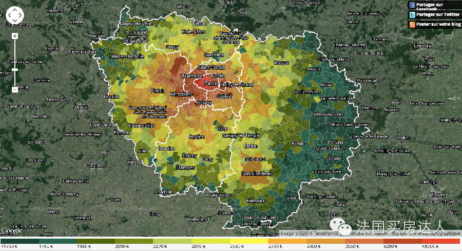 相比之下,巴黎近郊的房价则低了很多。巴黎近郊的房子(相当于北京五环以内,上海外环内)均价大约在3000-7000左右,其中92省最贵,均价在6000左右,94省次之,均价在4000多,93省最便宜,均价在3000多左右。(巴黎地区西南部为富人区,东北面则穷人聚集,也因此93房价相对较低)。而巴黎远郊则普遍在2000-5000欧元/平左右。