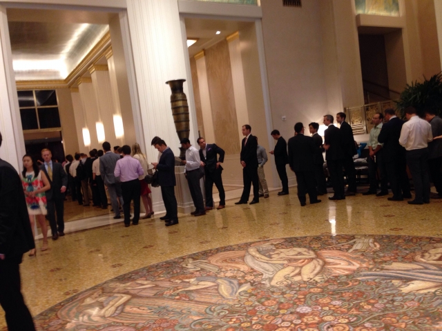 等候电梯的投资者排成长队,一些人担心无法准时抵达会场,而其他酒店客人则对这一喧闹场面一头雾水。