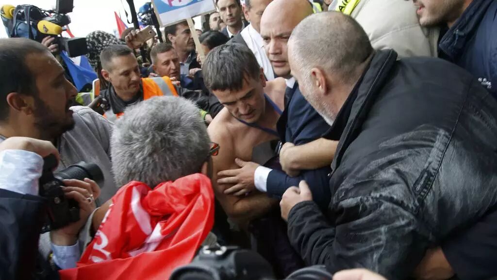 裁减业务重组计划预定在今天上午9点半提交到法航企业中央委员会,但据上午收到的消息,该委员会今天在集团在巴黎戴高乐机场总部的会议在召开一小时后就因数百名员工的示威而中断。集团人事负责人伯罗斯塔(Xavier Broseta)甚至受到愤怒员工的暴力围堵、殴打并被强剥上衣,最终在保安的护送下才得以脱身。法航随后发表声明强烈谴责这一暴力行为,法国交通部长阿兰•维达利(Alain Vidalies)声明“不能容忍”暴力行为。