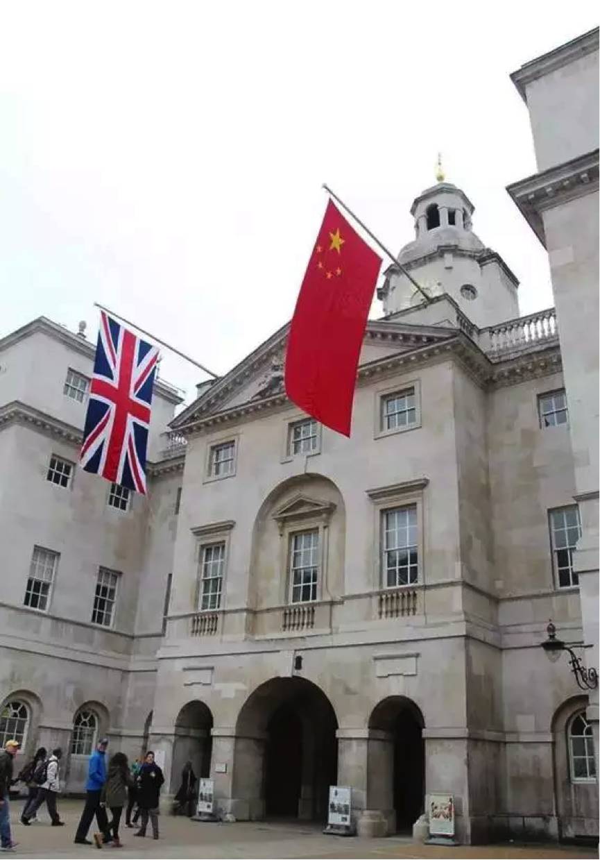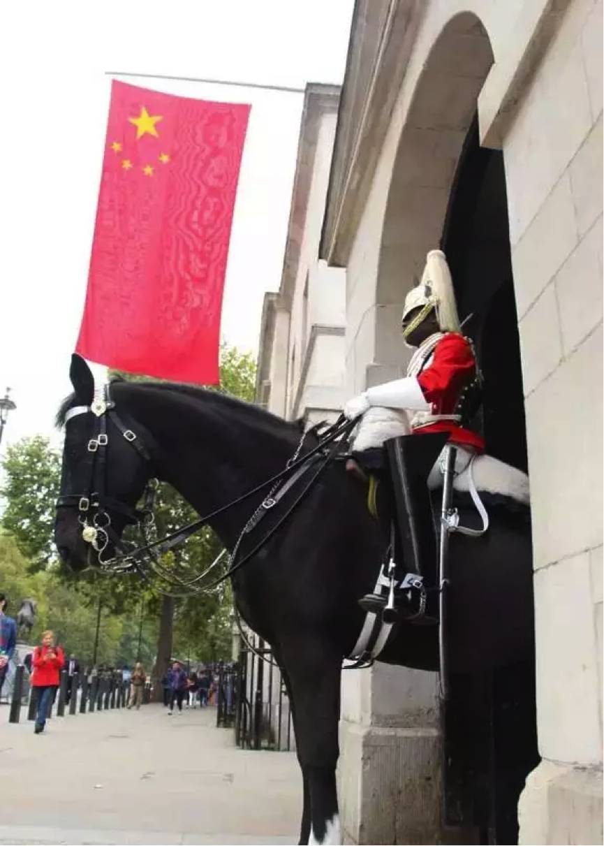 白金汉宫旁的皇家马厩大门,每天吸引来自全世界的游客,也挂上了中国国旗。