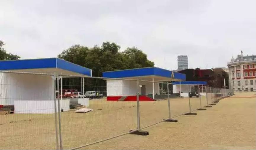 皇家马厩内搭建起来的棚子,,习近平和女王将第一次在这里见面。之后他们从这里搭乘马车前往白金汉宫。