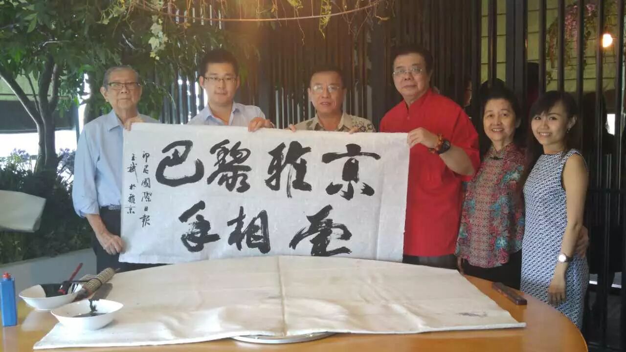 宴会间举行了笔会挥毫活动,阮渊椿与王玉斌共同挥写书法,交流书艺。阮渊椿现场应请书写了书法墨宝赠由法国书画家协会收藏,王玉斌挥毫书写“巴黎雅京手相牵”赠送给国际日报,并通过国际日报传媒,表达法国书画家协会及法国华裔同胞对印尼同胞的亲切问候!赵金川总裁代表本报欣然接受了王玉斌殊有意义的墨宝,并表示衷心感谢!